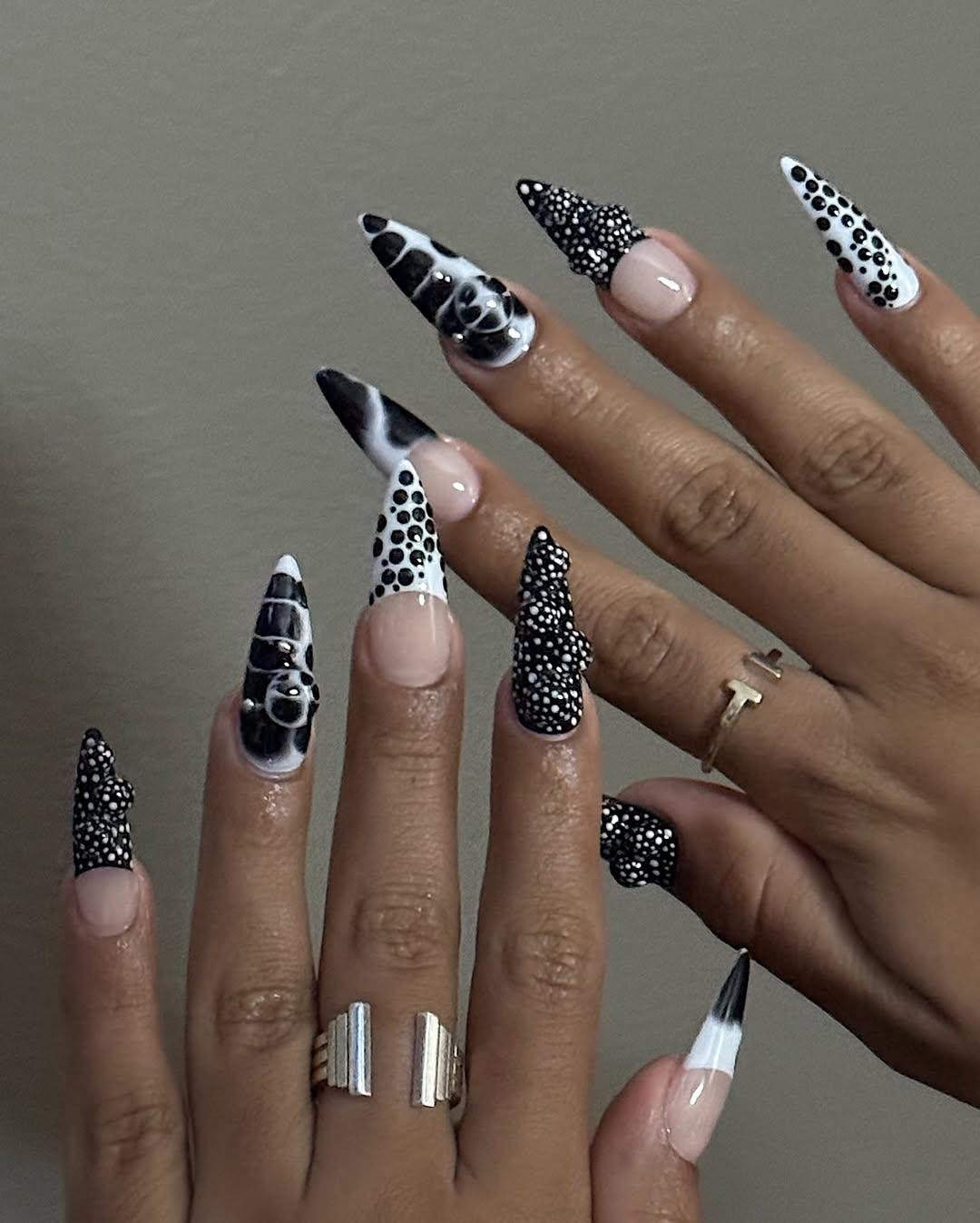 Любишь черно-белую гамму? И с ней можно сделать что-то прикольное на ногтях. Например, покрой каждый палец разными узорами. Это может быть и коровий принт, и модные растекающиеся пятна, и рисунок в мелкую точку. Чередуй френч и полное покрытие. Такой дизайн смотрится очень современно!