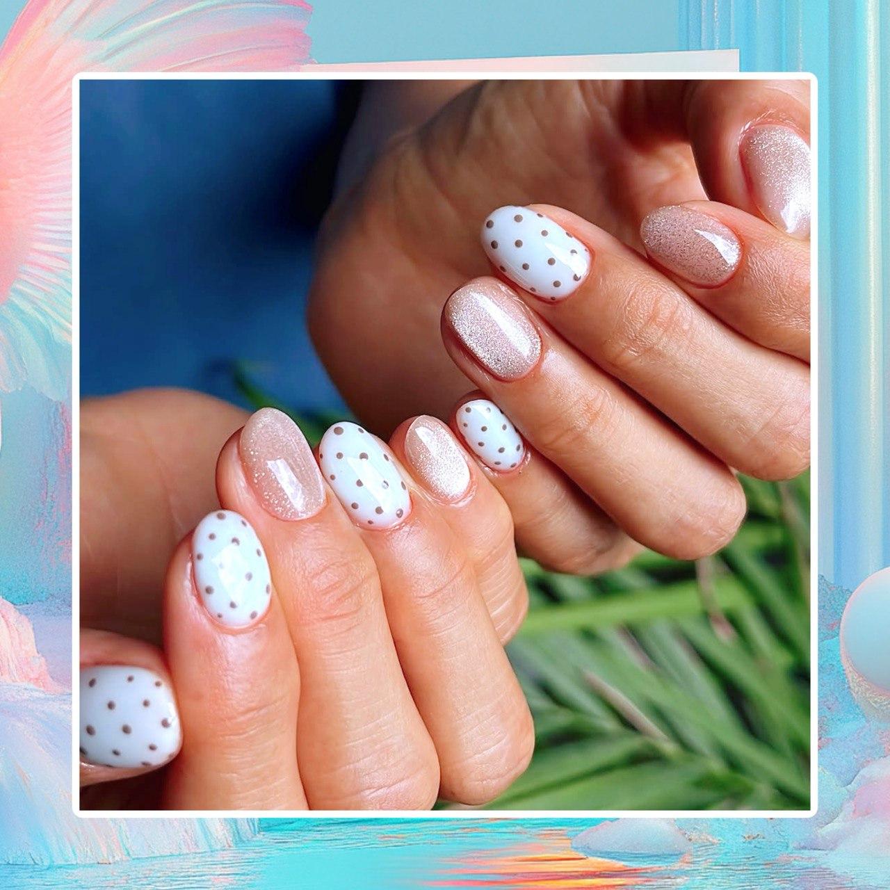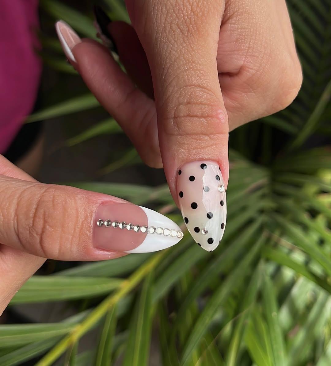 Если тебе хочется сделать на каждом ногте разный дизайн, но при этом лень рисовать или просто придумывать что-то сложное, то советую выбрать три элемента и по-разному их комбинировать. Например, это могут быть классический френч, стразы и узор в горошек.