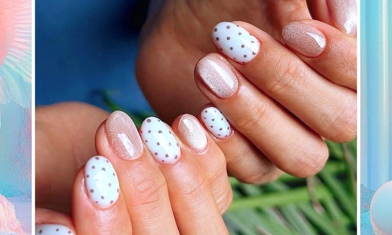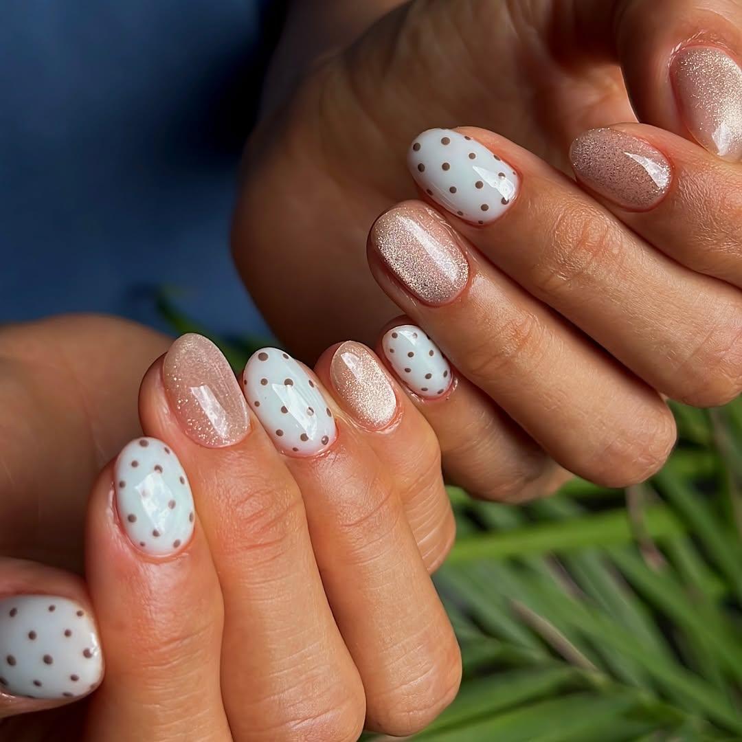 В этом маникюре нет ничего сложного. Тебе нужно лишь чередовать два разных варианта покрытия. Первый — однотонный «кошачий глаз» в бежевом или светло-коричневом оттенке. Вариант с крупными блестками будет смотреться ярче, а шелковая «кошка» выглядит деликатнее. На других пальцах пусть будет молочный или пастельный лак, украшенный аккуратным принтом из коричневых горошин.