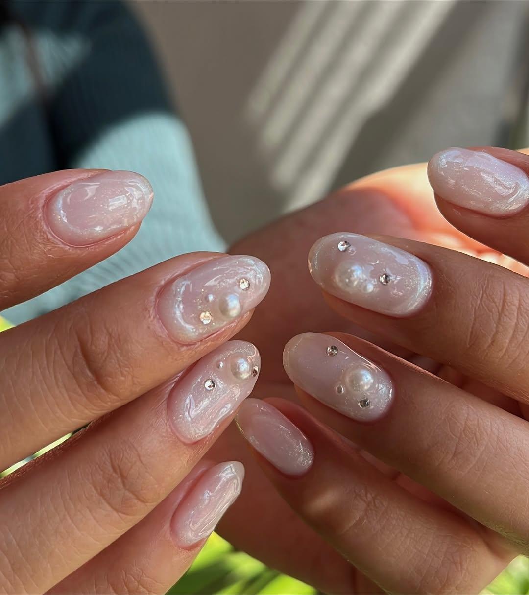 Молочный маникюр со втиркой или мелким светлым шиммером станет украшением любых рук. Он выглядит изящно и нежно, но я советую добавить к нему объемный гель для текстуры и стразы разных видов — обычные и жемчужные. Такой дизайн понравится любительницах корейских нейл-луков и тем, кто скучает по эстетике mermaidcore. Носи эти ногти сейчас или сохраняй идею до лета!