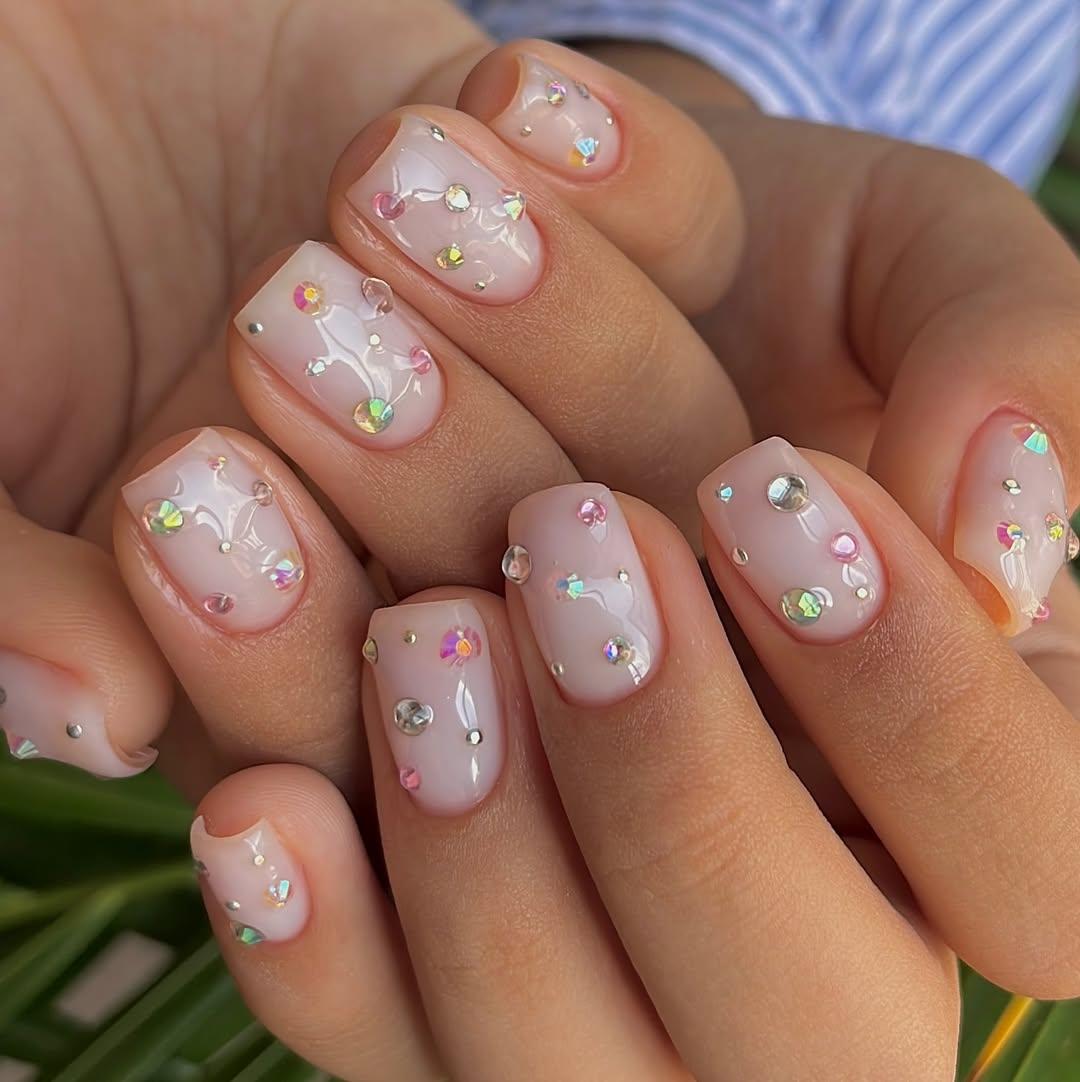 Стразы на ногтях обычно делают руки очень броскими и привлекают внимание, но если выберешь пастельные камушки и приклеишь их на нюдовую базу, то маникюр получится очень нежным. Советую поиграть со стразами разных форм и размеров, а основу выбрать полупрозрачную молочную или едва заметный розовый нюд.