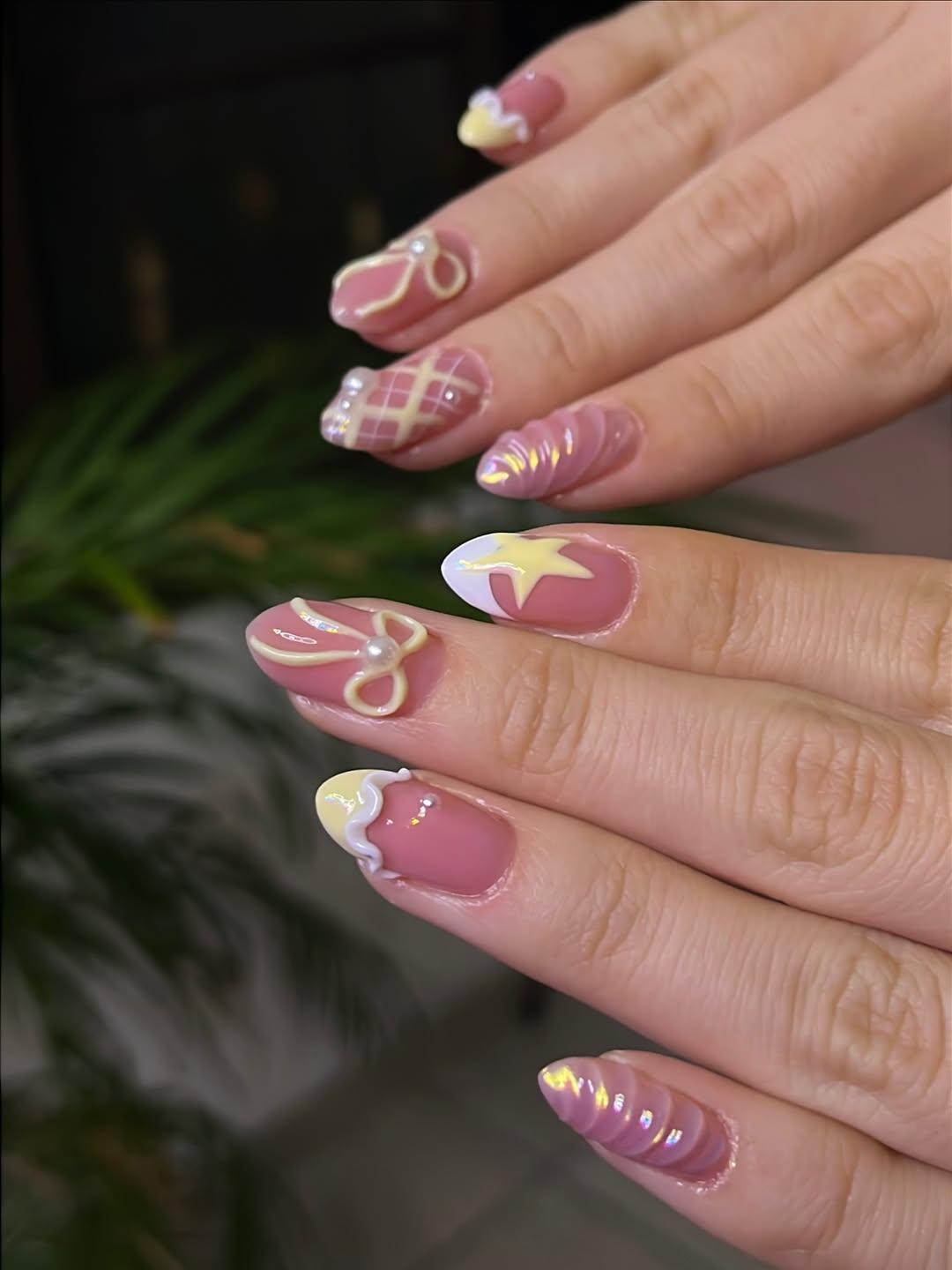 Если любишь банты и рюши, перенеси их в свой маникюр. Особенно красиво они будут смотреться в комбинации сливочного желтого с белым. Дополнить такой дизайн можно френчем, рисунками звездочек, клетчатым принтом, втиркой и жемчужинами. Получится нарядно и смело, но очень нежно!