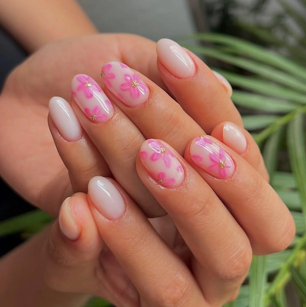 Комбинация молочной базы с розовыми цветами — беспроигрышный вариант нежного маникюра. Даже яркие, почти неоновые цветочки будут смотреться круто. Да, немного по-летнему, но кому не хочется вернуться в теплую погоду? Серединки цветов укрась золотыми блестками или поталью.