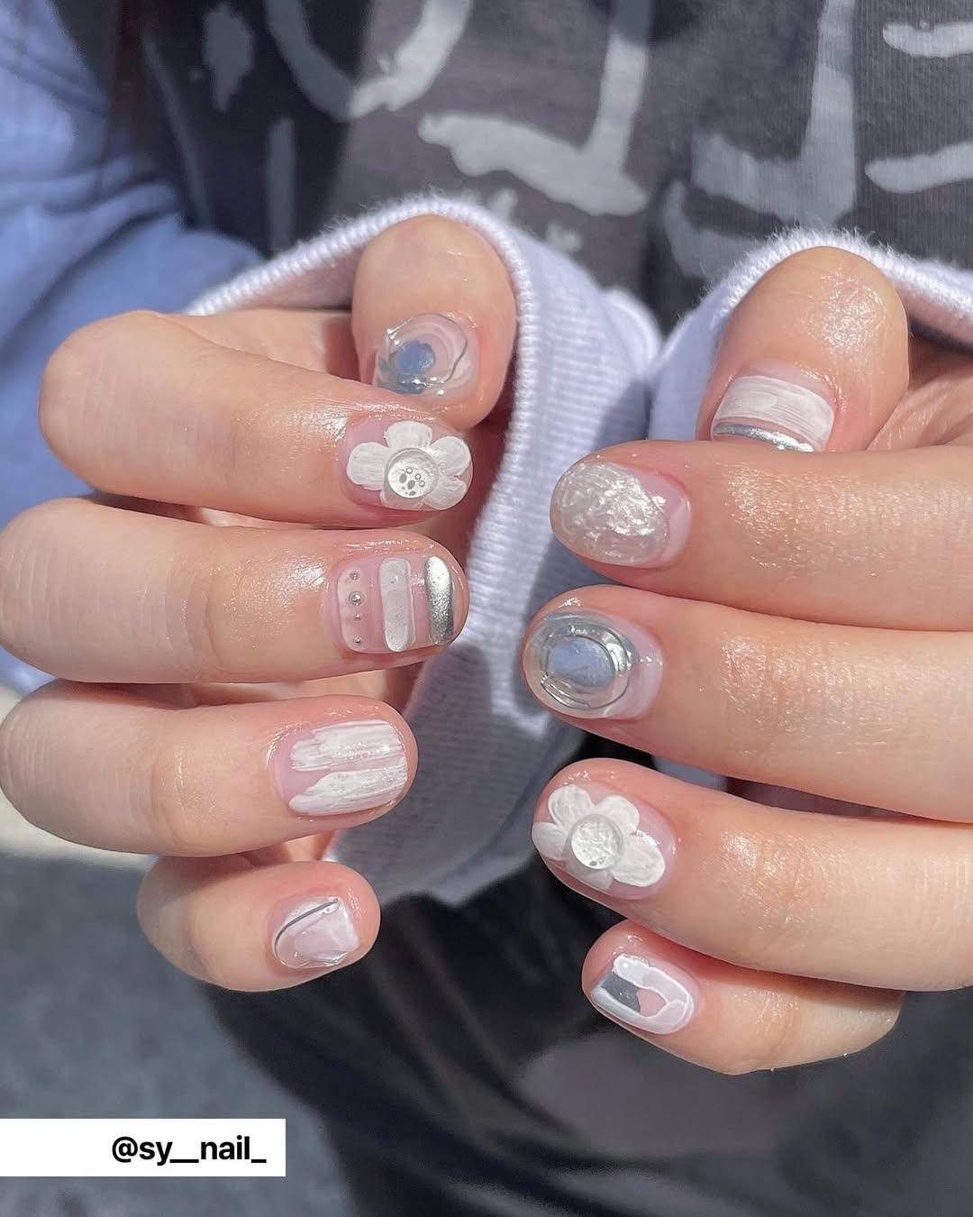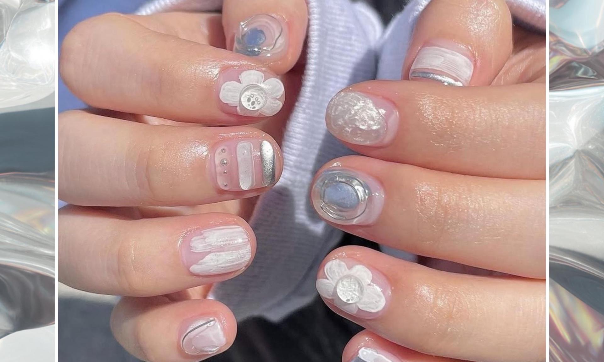В таком маникюре сделай акцент на объемы. Например, нарисуй милый белый цветочек, а потом укрась его прозрачным гелем в серединке. Или сделай три объемные полоски на прозрачной базе и покрой их разными лаками: белым, серебристым блестящим и глянцевым топом. На остальных пальчиках сделай разные дизайны той же светлой, сияющей гамме.