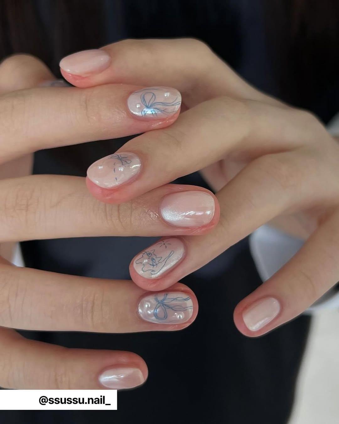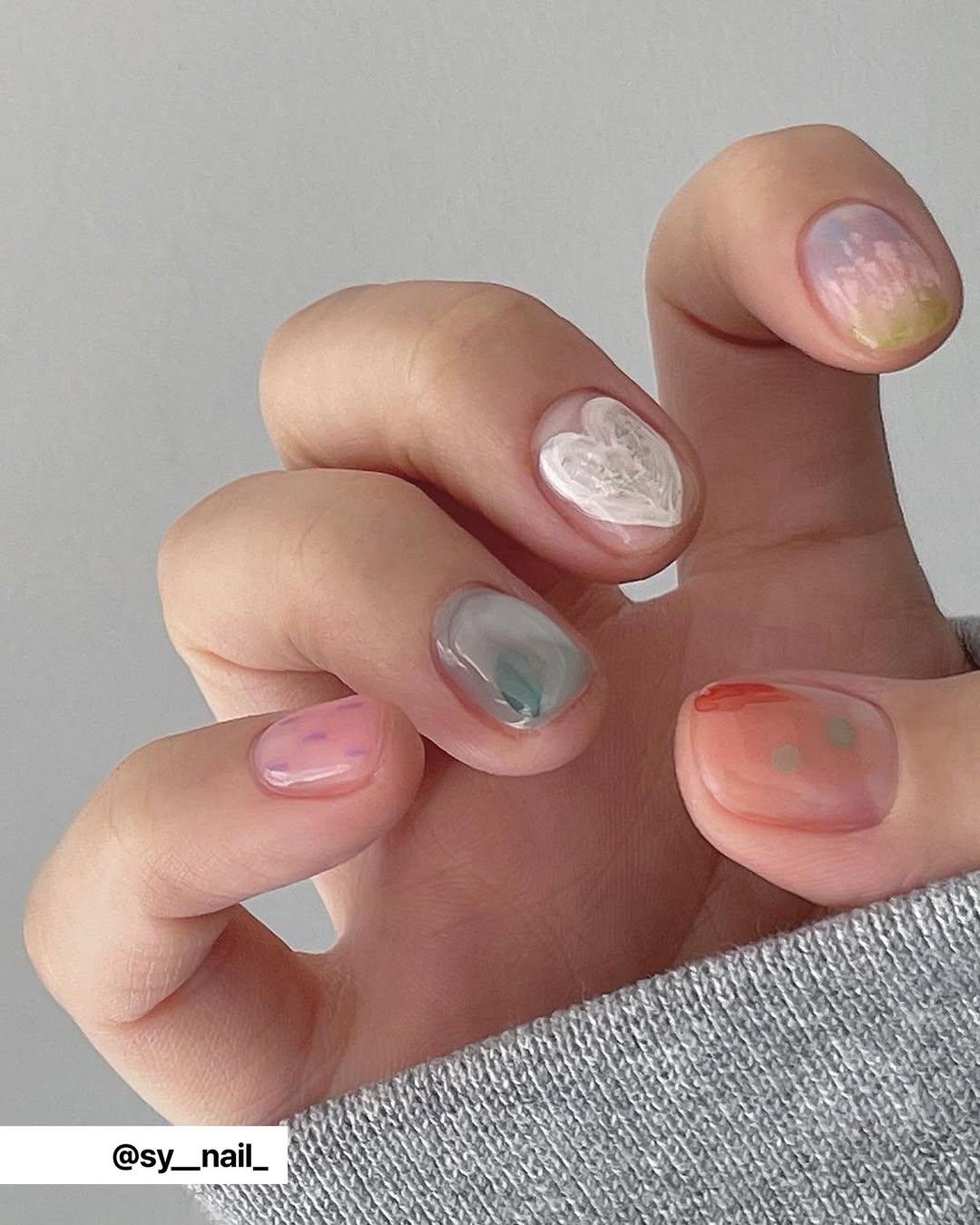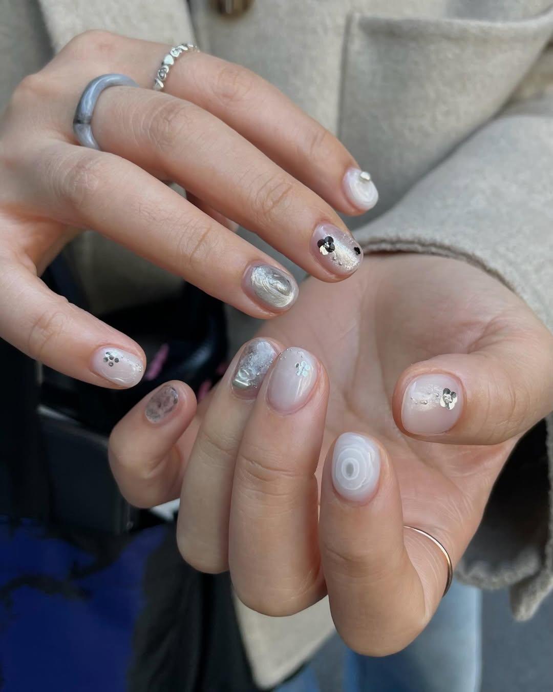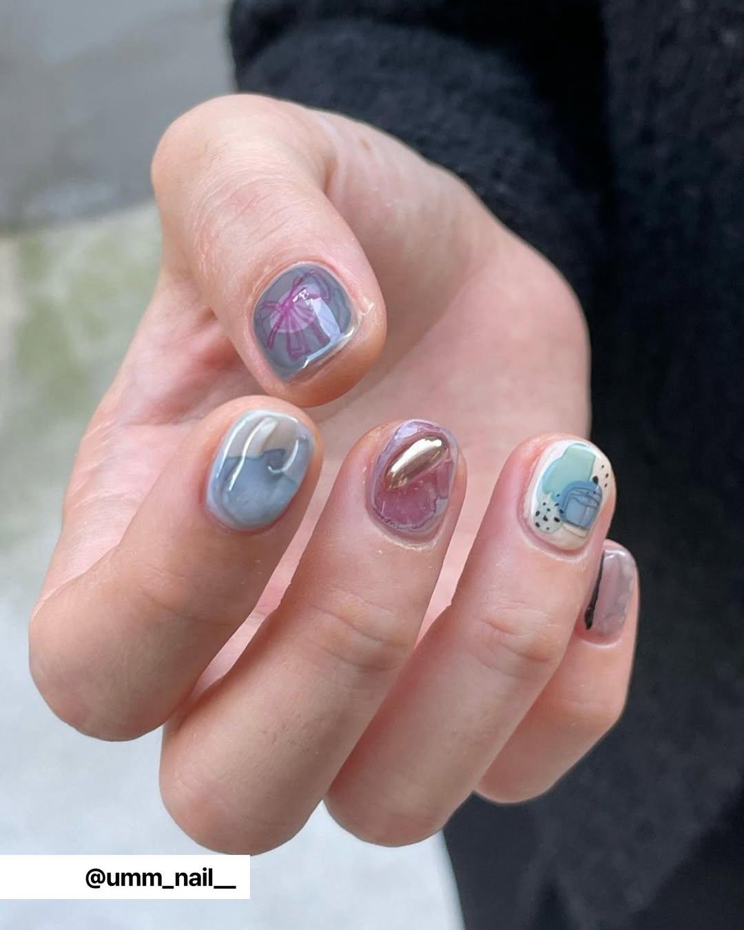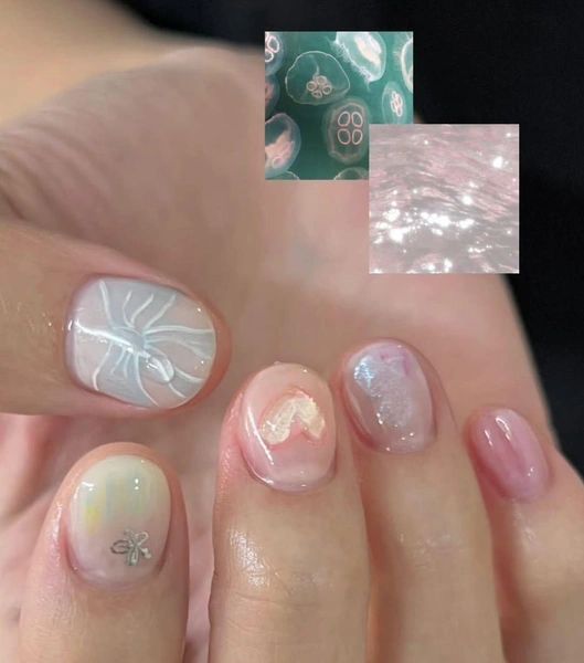 Честно говоря, такой маникюр легко назвать рандомным, потому что трудно выделить в нем определенные черты. Он очень нежный и воздушный, по-настоящему акварельный. А на каждом ногте — разный дизайн: бантик, блестки, объемное сердечко, маленький се серебристый цветочек.