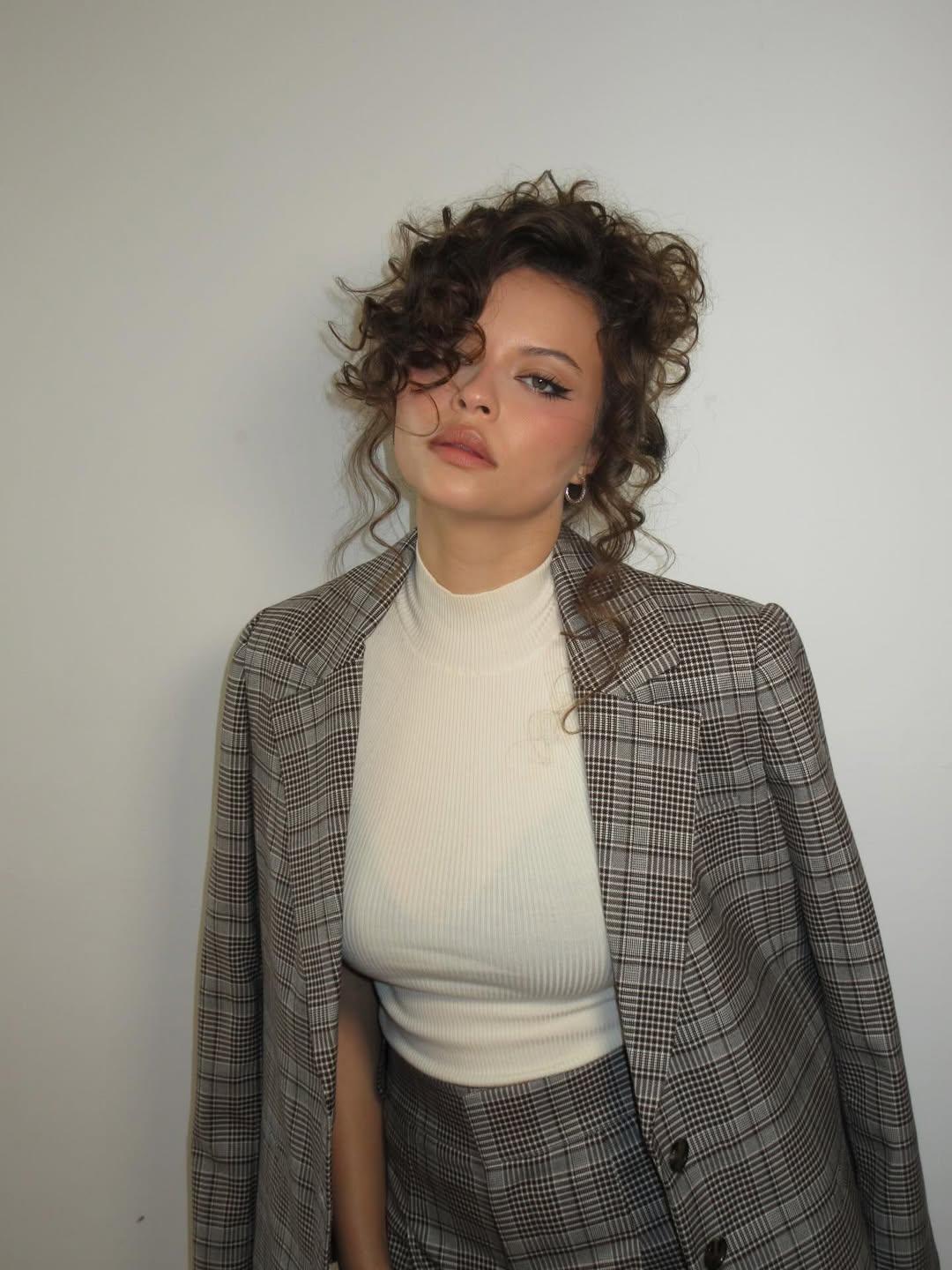 Актриса Изабелла Бриггс — настоящий эксперт по высоким кудрявым прическам. Особенно вдохновляет ее образ с локонами, собранными в элегантный высокий пучок, но при этом отдельные пряди, мягко зачесанные набок, деликатно обрамляют лицо.