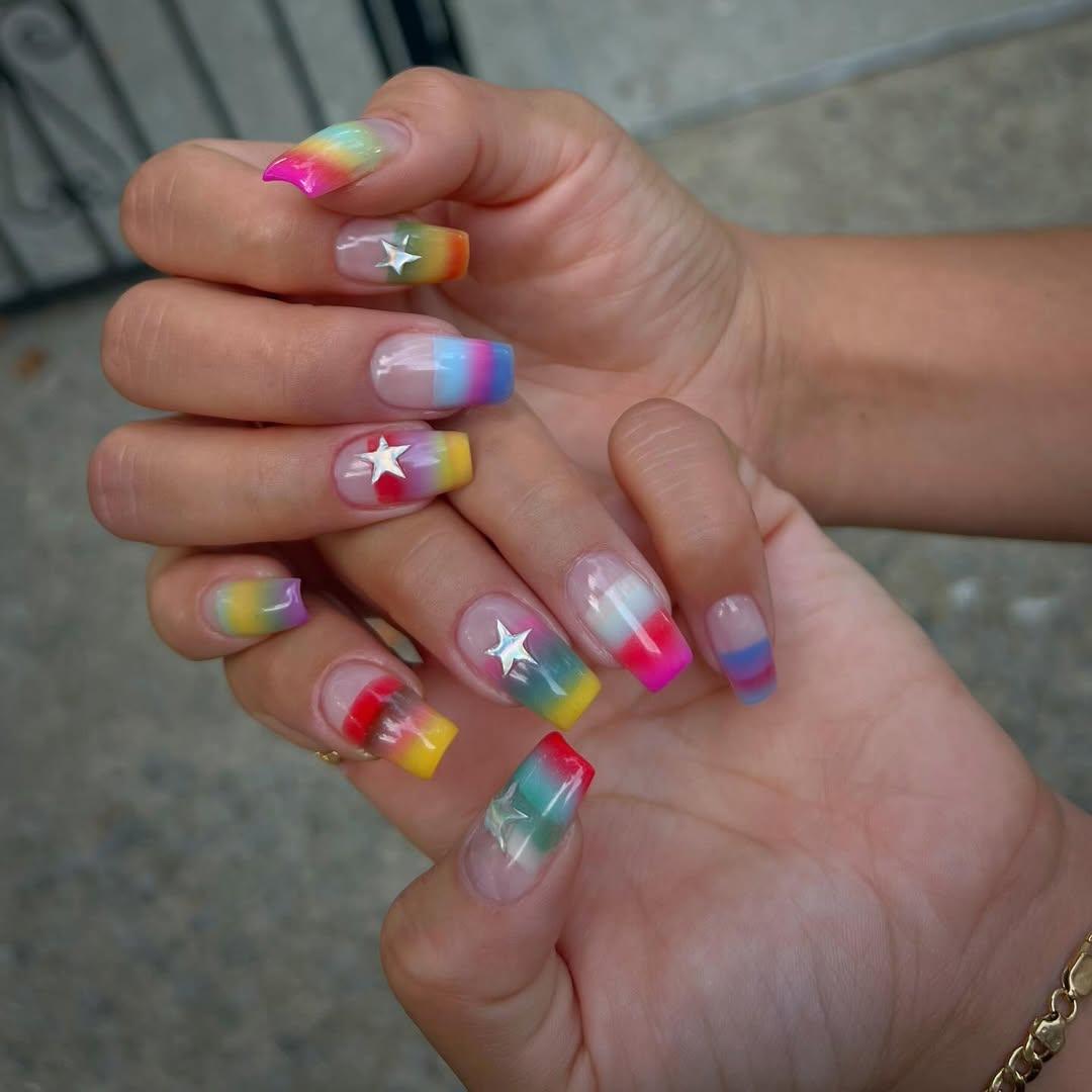 Если ты хочешь совместить минимализм и максимализм в одном дизайне, то этот вариант — тот самый идеальный маникюр. В нем френч с аккуратными графичными линиями сочетается с яркими оттенками. На длинных квадратных ногтях он выглдяит особенно выразительно, ведь геометрия визуально удлиняет пальцы, а прозрачная база не дает утяжелить дизайн.