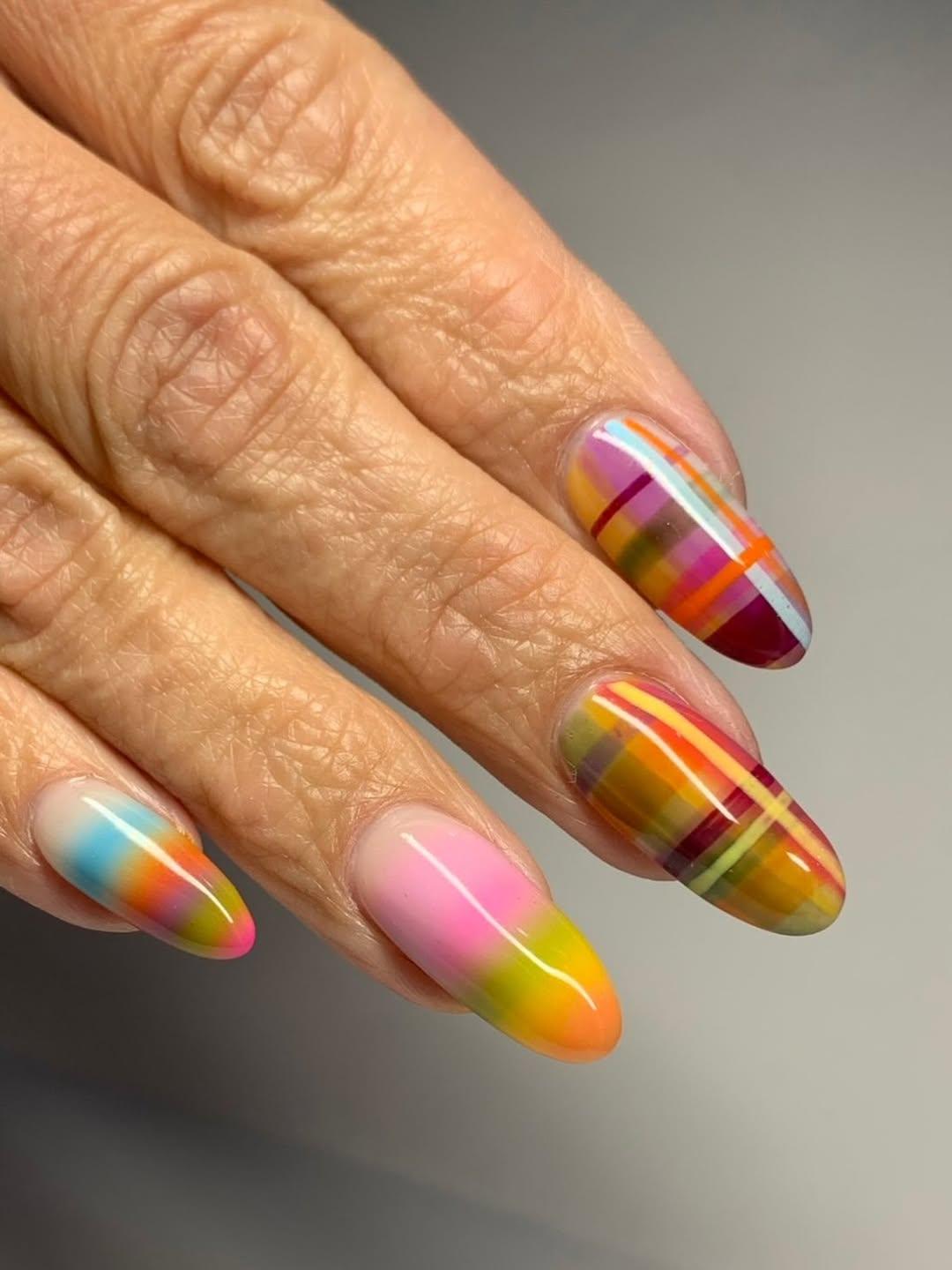 Маникюр с градиентными полосками кажется слишком банальным? Или просто не хочешь иметь одинаковый дизайн на всех пальцах? Тогда комбинируй полосатый узор, вдохновленный свитером, с клетчатым принтом. У тебя получится ну очень яркий нейл-арт, который захочется сочетать со всеми смелыми образами в этом холодном сезоне!