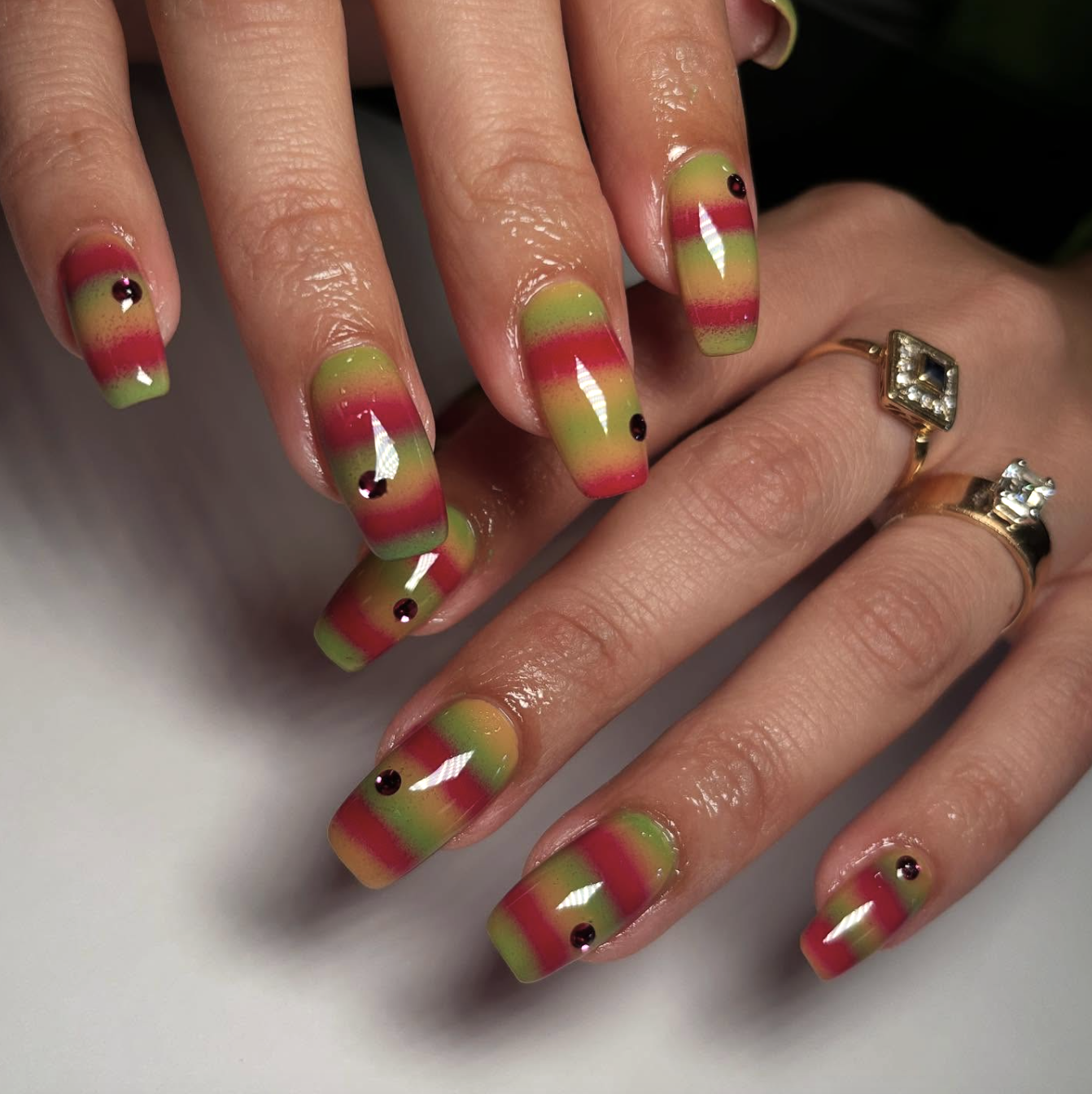 Осенью и зимой хочется уюта, поэтому актуальными становятся маникюры (макияжи, наряды и вообще все) в теплых оттенках. Поэтому советую сделать дизайн с оранжевыми, клубничными и желтыми полосками. Добавь оливковые акценты, чтобы ногти выглядели ярче. А в конце укрась маникюр стразами или даже пайетками. Так ногти будут еще более нарядными!