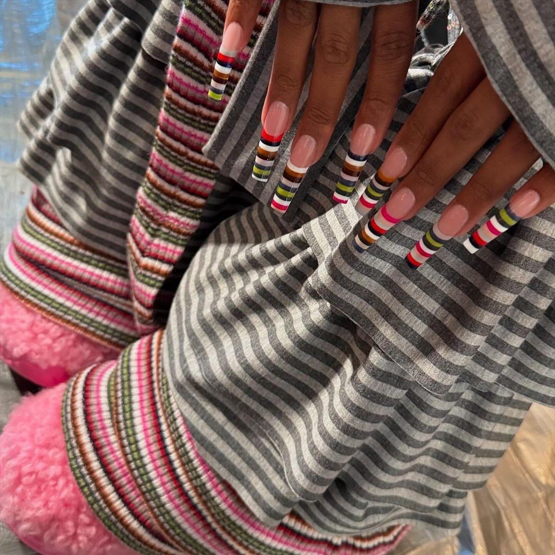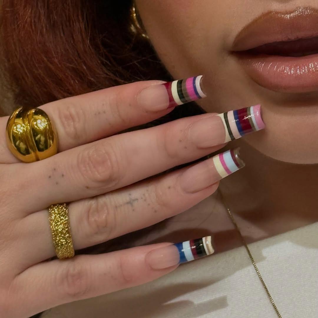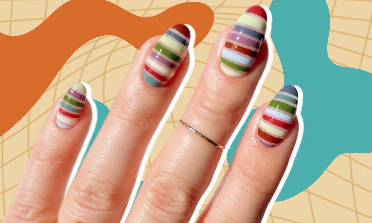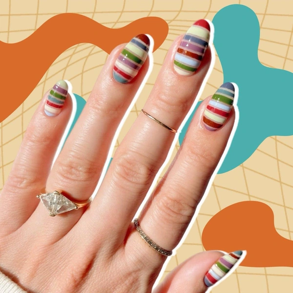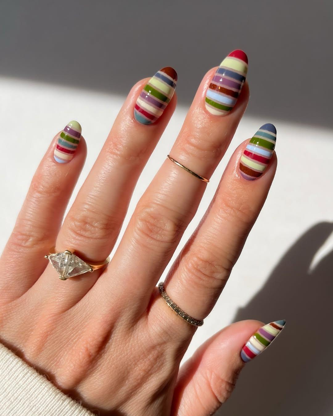 Чтобы твой маникюр смотрелся интереснее, советую сочетать на ногтях полоски разной ширины. Такая комбинация напоминает об университетских шарфах или эстетике нулевых. Используй приглушенные оттенки вроде бордового, оливкового и серого. Еще интереснее будет, если добавишь в дизайн линии без цвета, сквозь которые будет виден натуральный ноготь.