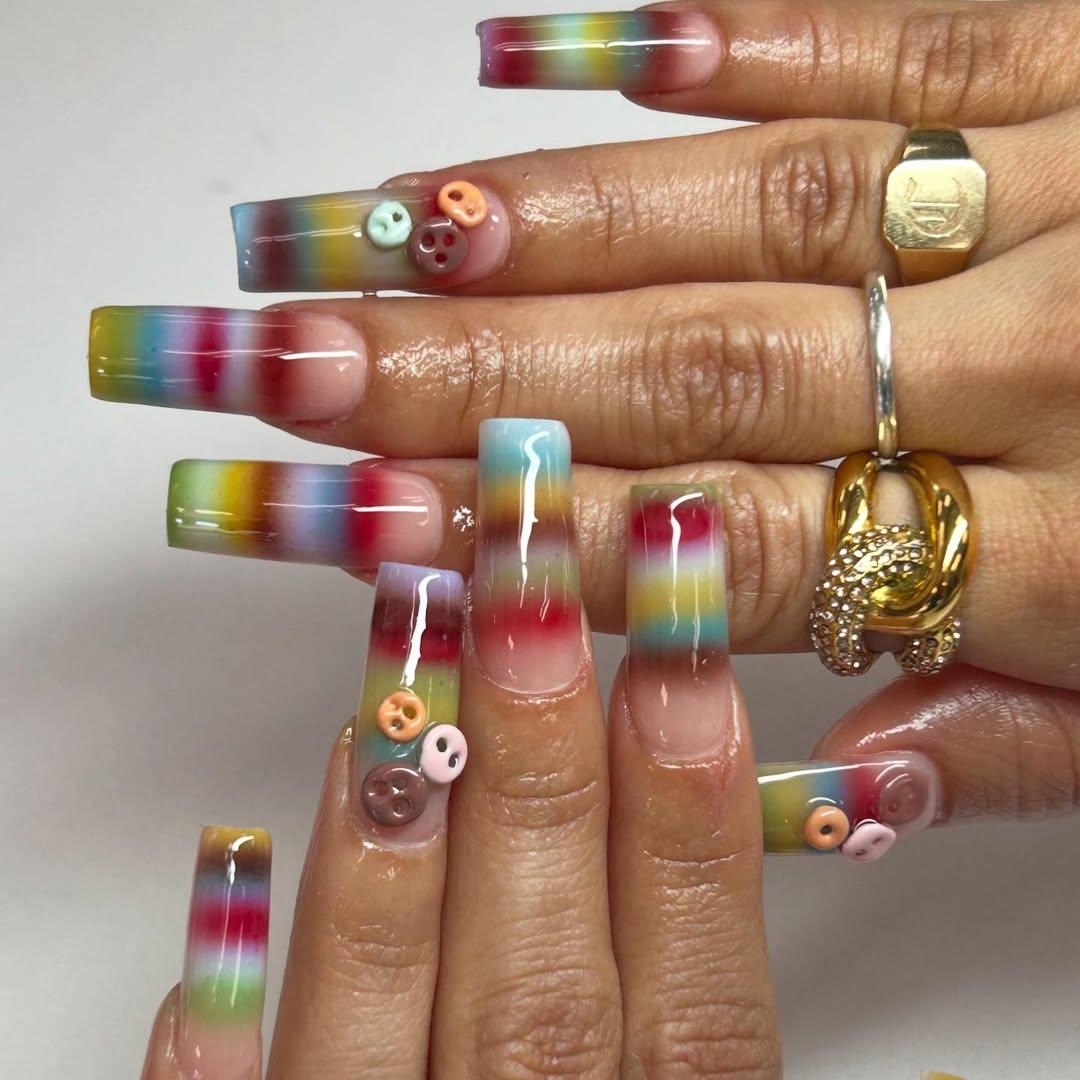 Самый забавный вариант маникюра в этой подборке — нейл-арт с пуговицами. Сейчас это главный тренд корейского маникюра! Каждая деталь этого дизайна будто сошла с любимого свитера из нулевых: мягкий градиент, леденцовые оттенки, разноцветные пуговицы. Такой маникюр точно не оставит никого равнодушным!