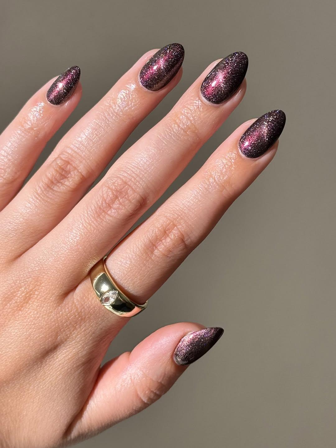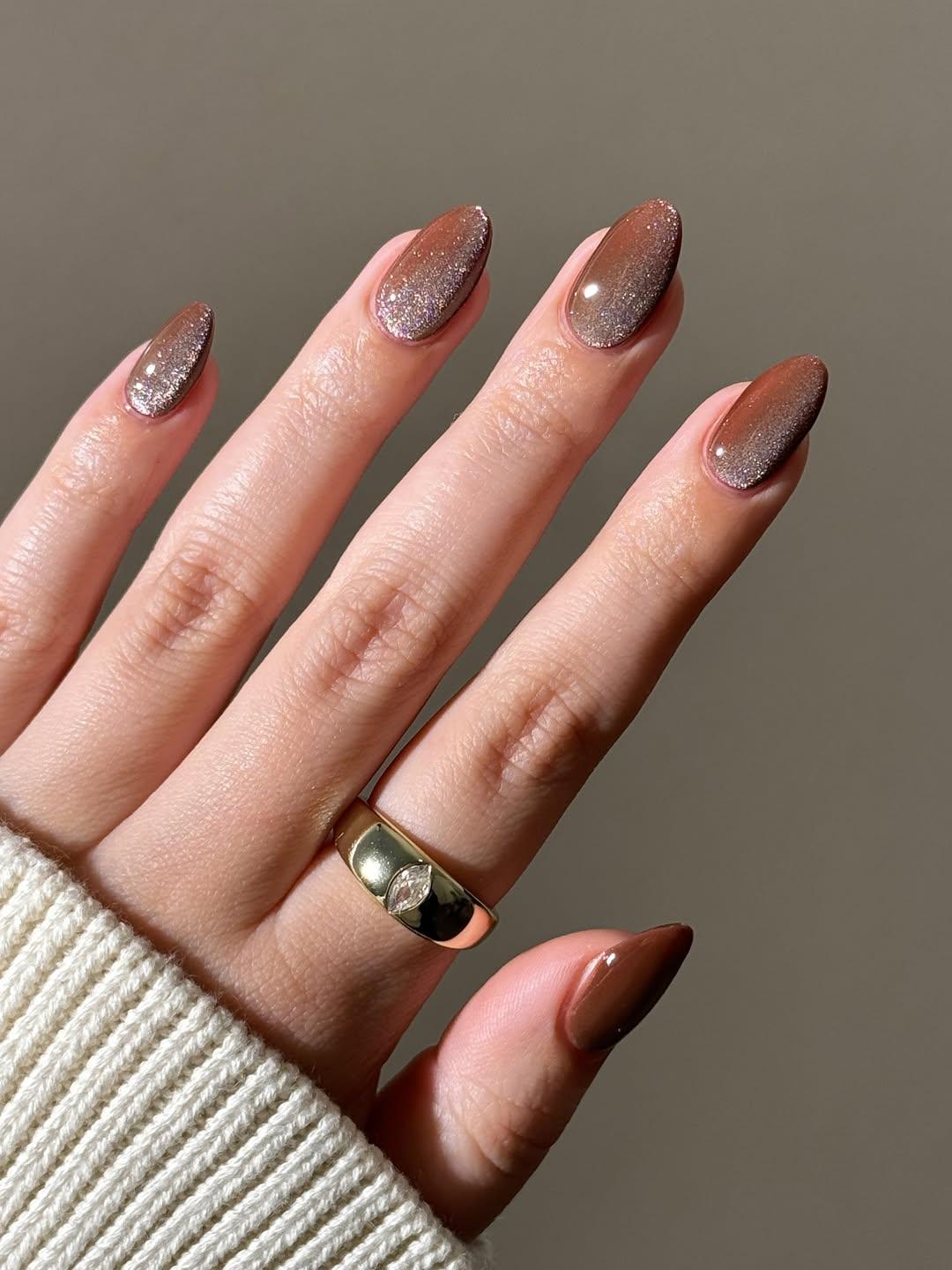 Но вообще однотонные маникюры с классическими бликами смотрятся не менее эффектно. Коричневый с серебристыми блестками — отличное сочетание для любительниц холодных оттенков. Если тебе близка осенняя эстетика с дождями и какао, то это твой вариант. Сложный черно-бордовый цвет тоже выглядит элегантно с разными бликами.