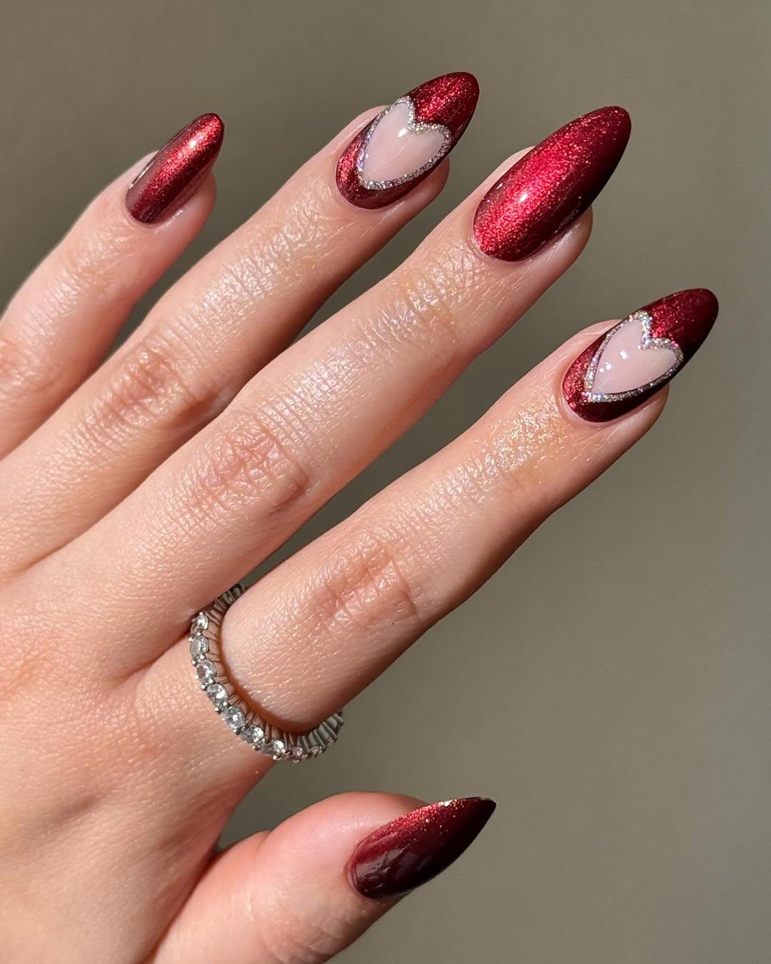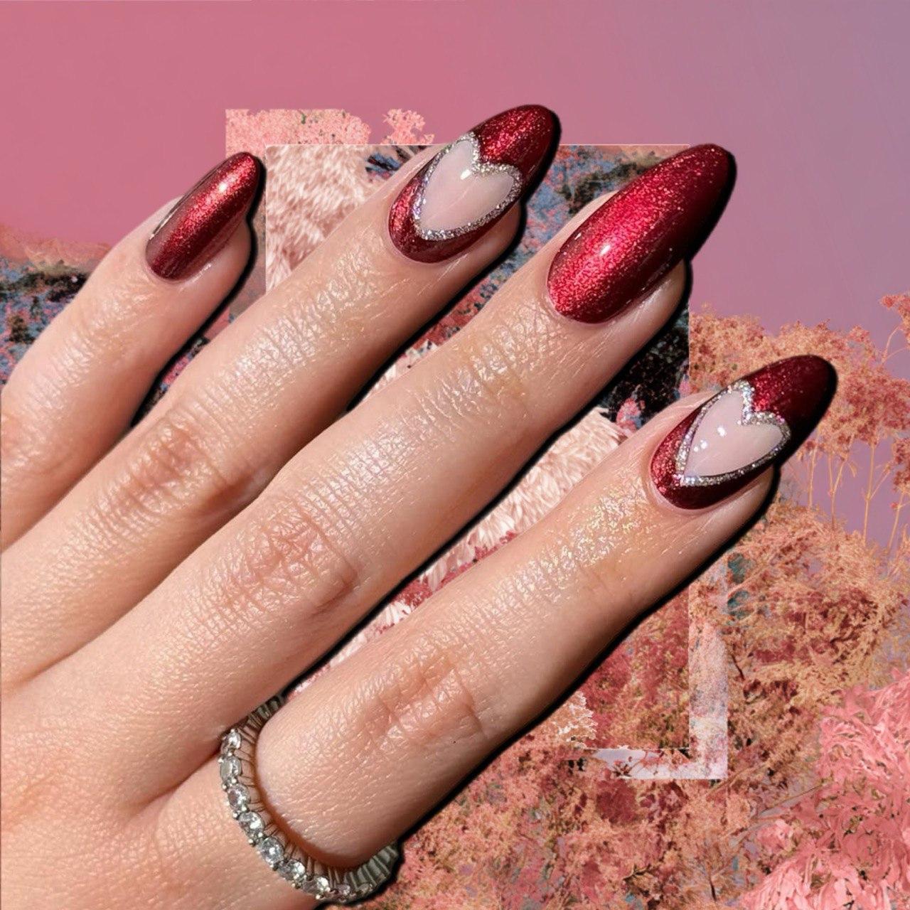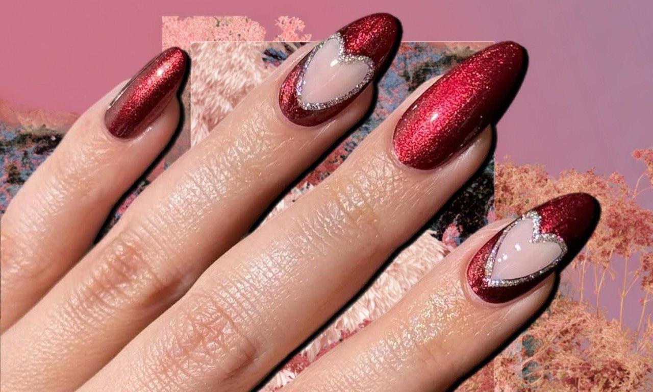 Еще можешь разнообразить маникюр с дизайном negative space, то есть с пустым пространством. На нескольких ногтях сделай полное покрытие каким-нибудь красным или бордовым магнитным лаком, а на остальных нарисуй в центре крупное сердце и закрась этим же цветом все вокруг. Так рисунок в середине будет пустым. По краю обведи его линией из миниатюрных страз или серебристого лака. Получится очень элегантно!