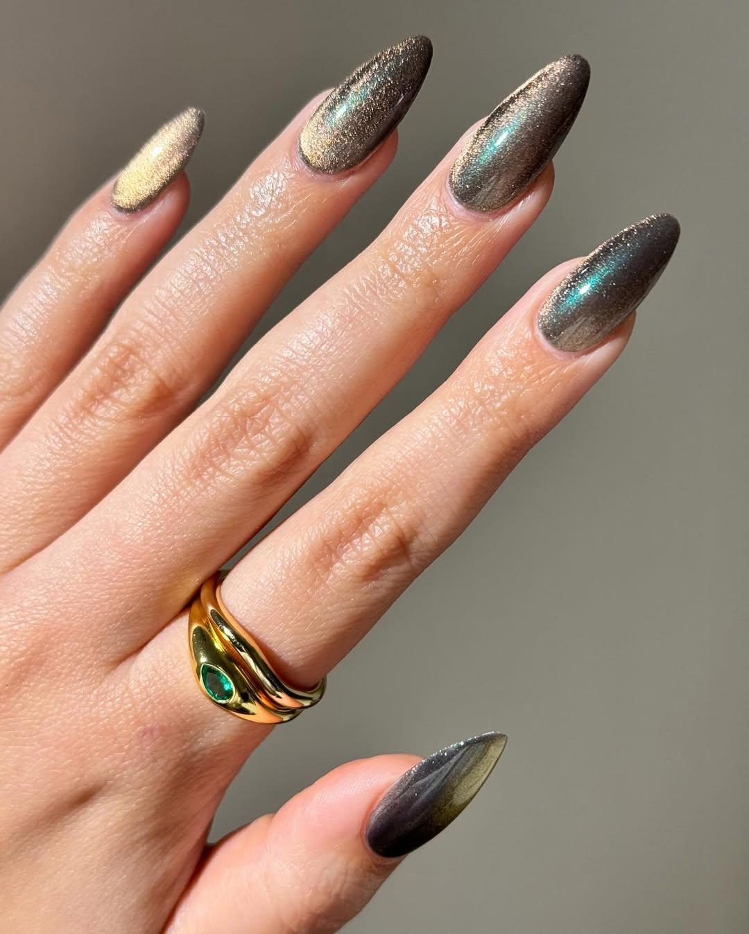 Персиковый «кошачий глаз» будет круто смотреться на девушках с длинными ногтями, которые хотят чего-то интересного, но не слишком яркого. А сочетание темного лака с золотом и голубым блеском станет любимым вариантом тех девчонок, которым нравятся необычные однотонные маникюры и эффект втирки без мороки с самой блестящей пудрой.