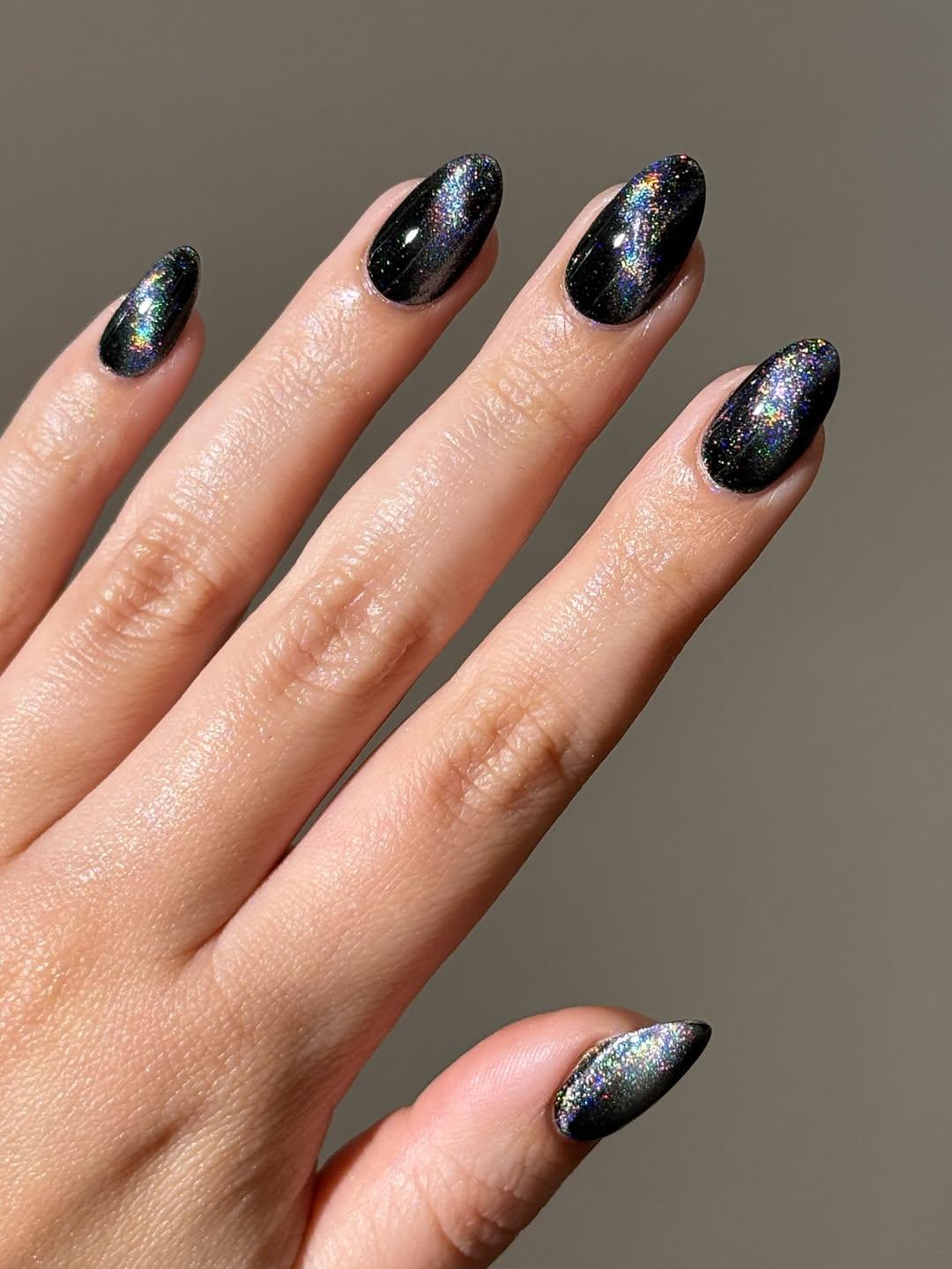 Очень круто будет смотреться черный маникюр с голографическими блестками. Попробуй сделать с его не с классическим круглым бликом в серединке или на боковой части, а с полоской по диагонали. Такой дизайн выглядит необычно и довольно футуристично. Покрытие выглядит космически круто!