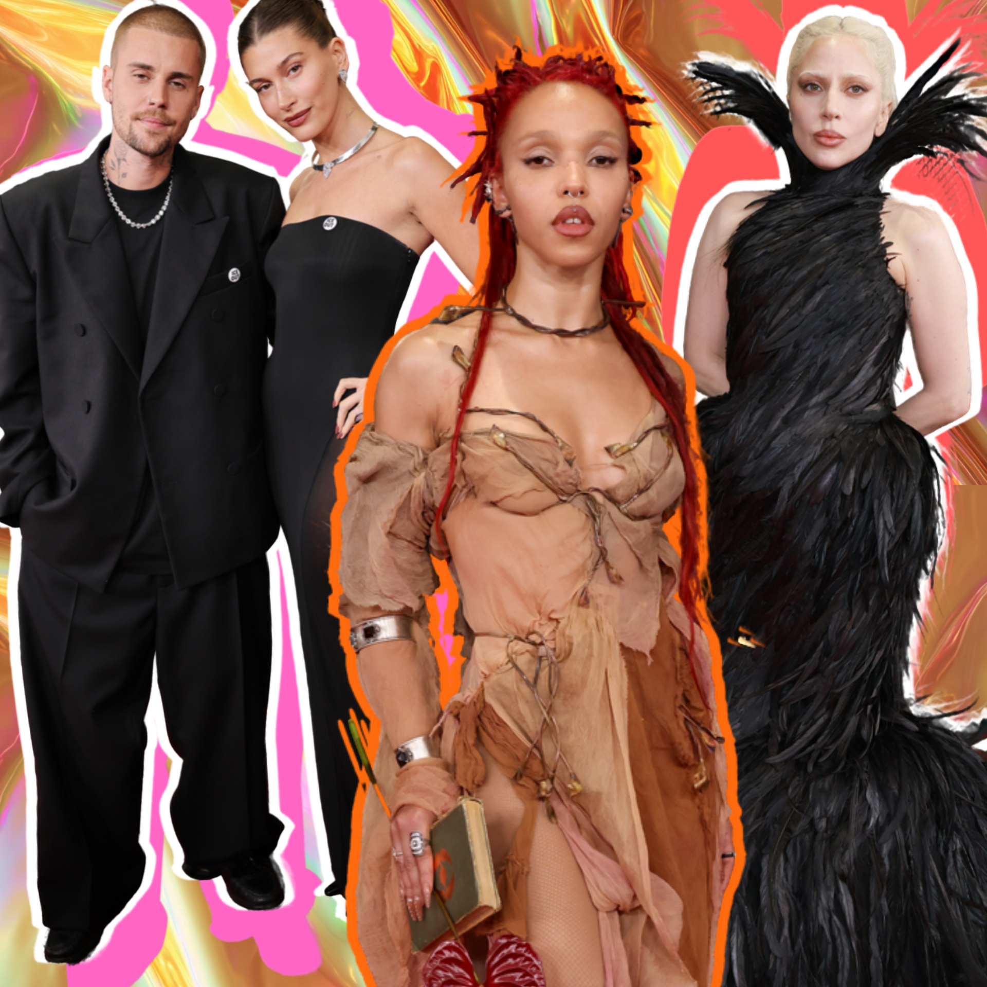 FKA Twigs пошла по пути сказочной трансформации и появилась в образе, напоминающем только что ступившую на сушу Ариэль. Автор платья — Paolo Carzana — явно задумал вернуть интерес к экзотическим цветочным формам: антуриумы снова в игре. Джастин и Хейли Бибер выбрали Balenciaga и Alaïa соответственно, дополнив образы значками «ICE Out» — прямым и недвусмысленным политическим высказыванием.