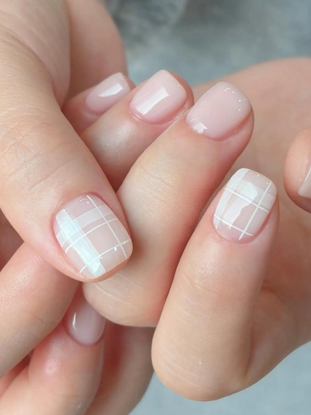 Этот маникюр можно назвать самым строгим в подборке за счет его геометрического узора — клеточек. Сначала покрой ногти молочной базой, а потом тончайшей кистью и белым лаком нарисуй узор. Чередуй изящные линии и полоски потолще.