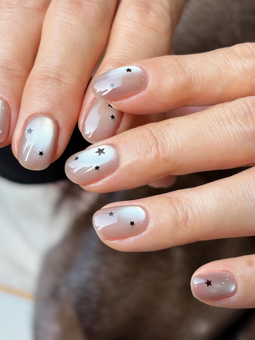 Нюдовый лак с эффектом «кошачий глаз» смотрится безумно нежно! Магнитом создавай блик в центре, а потом приклеивай поверх маленькие кусочки глиттера в виде звездочек. Такой маникюр смотрится очень минималистично, но скучным его не назвать.