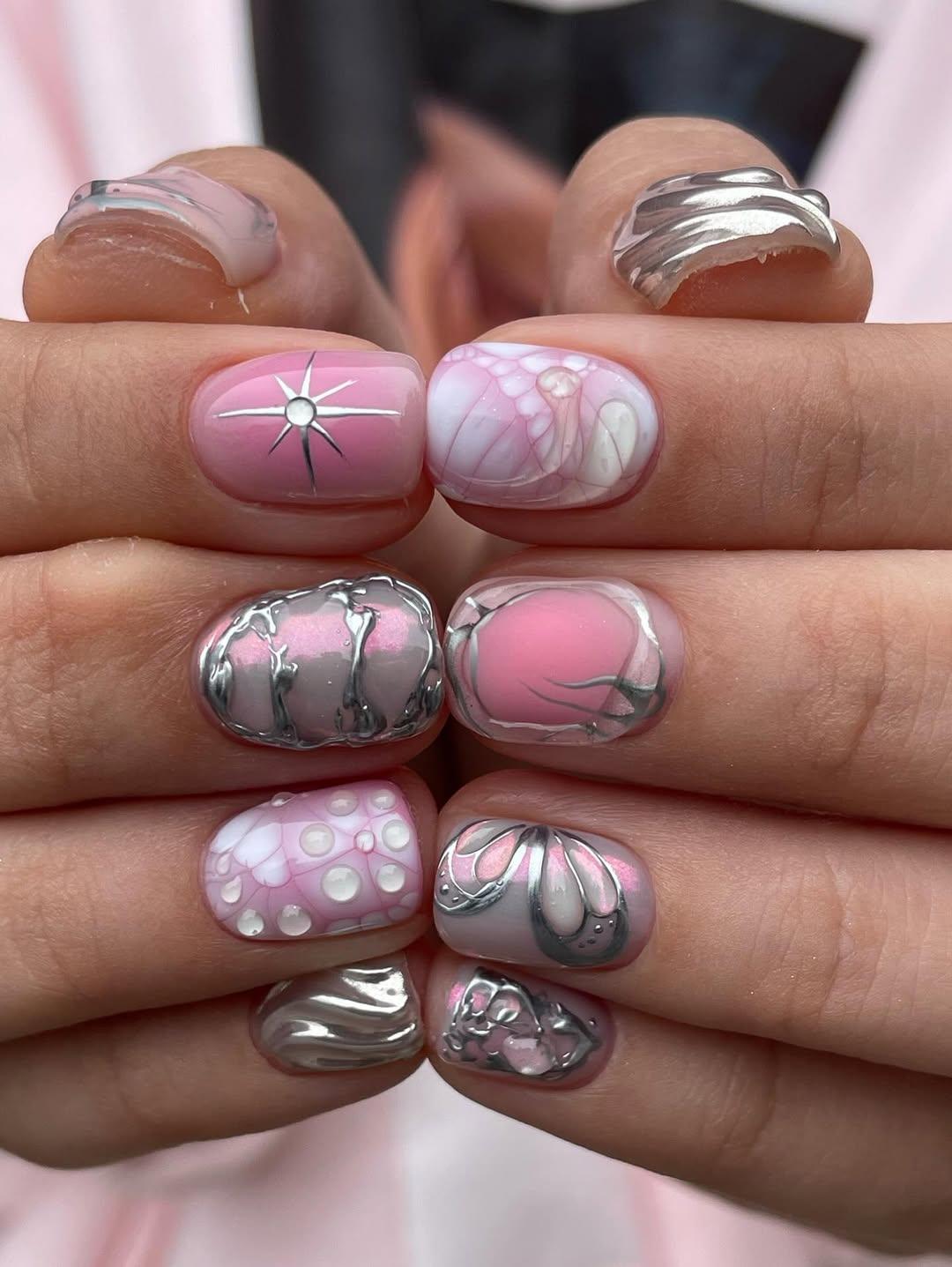 Для тех, кто не боится экспериментировать и любит уникальные решения! Сочетание нежного розового с холодным серебристым металликом и необычными 3D-элементами создает настоящий шедевр на твоих ногтях.