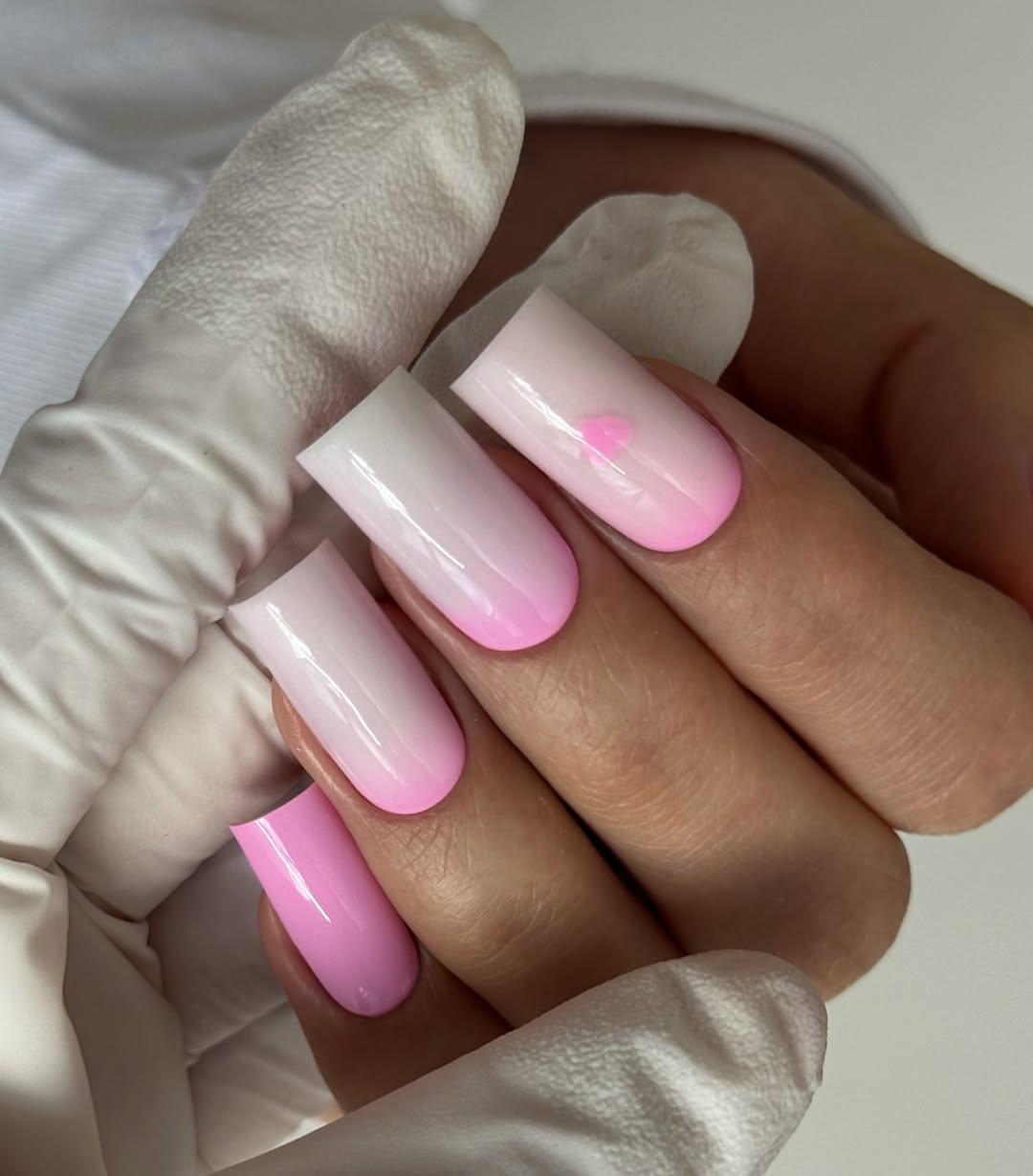 Этот дизайн выглядит очень аккуратно и женственно, визуально удлиняет ногти и подходит абсолютно к любому образу — от делового до вечернего. Он универсален и всегда уместен, добавляя рукам изящества. А маленькое сердечко на одном из ногтей, выполненное в том же градиенте, добавит игривости и милоты, подчеркивая твою романтичную натуру.