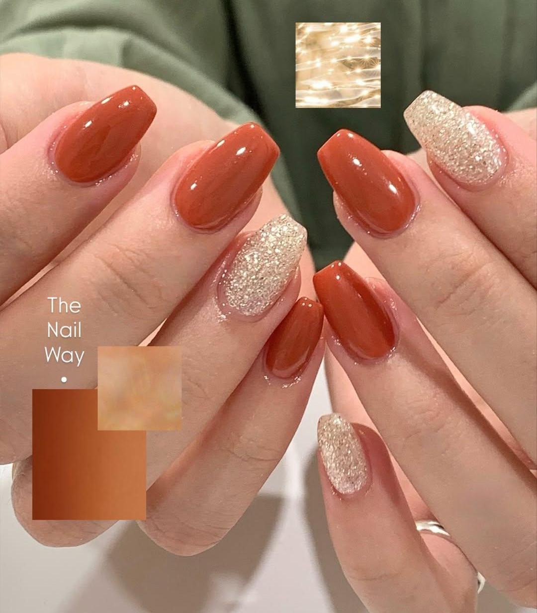 Когда на ногтях рисовать даже что-то минималистичное вроде точек лень, на помощь придет блестящий лак. Чередуй цвета покрытия: на одном пальце пусть будет темный оранжевый, а на следующем золотой. Или же сделай сияющий цвет акцентом и покрой им по одному ногтю на каждой руке.