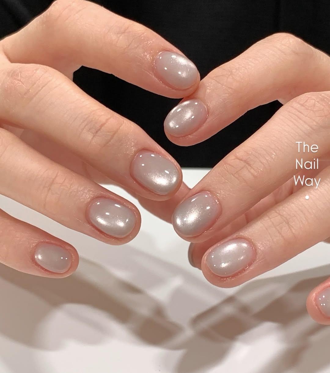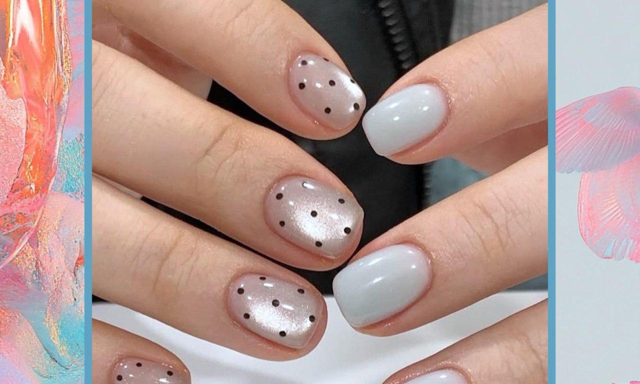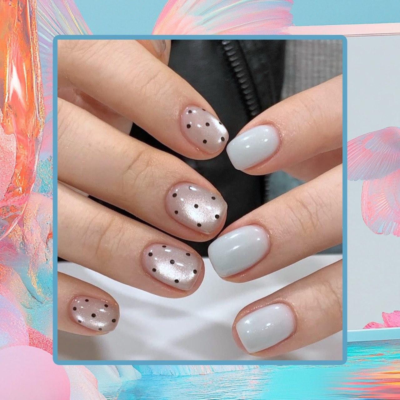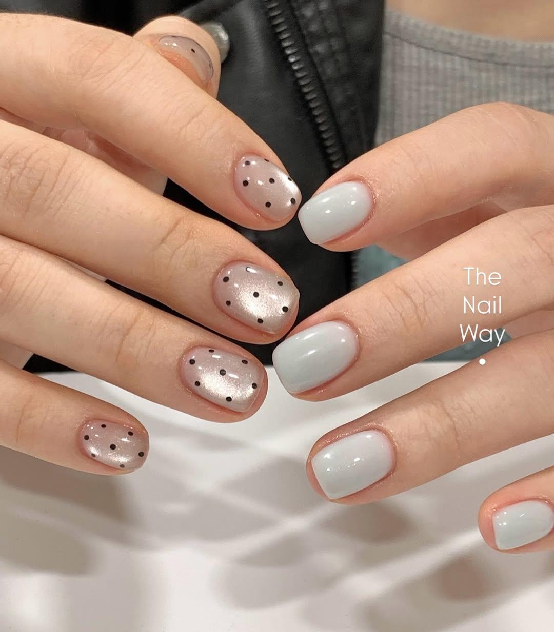 А если хочется как-то разнообразить маникюр, то сочетай его с каким-то простым дизайном. Например, на одной руке сделай покрытие молочно-голубого цвета, а для другой выбери серебряный «кошачий глаз» с узором в черный горошек. Повторить такой маникюр очень просто!