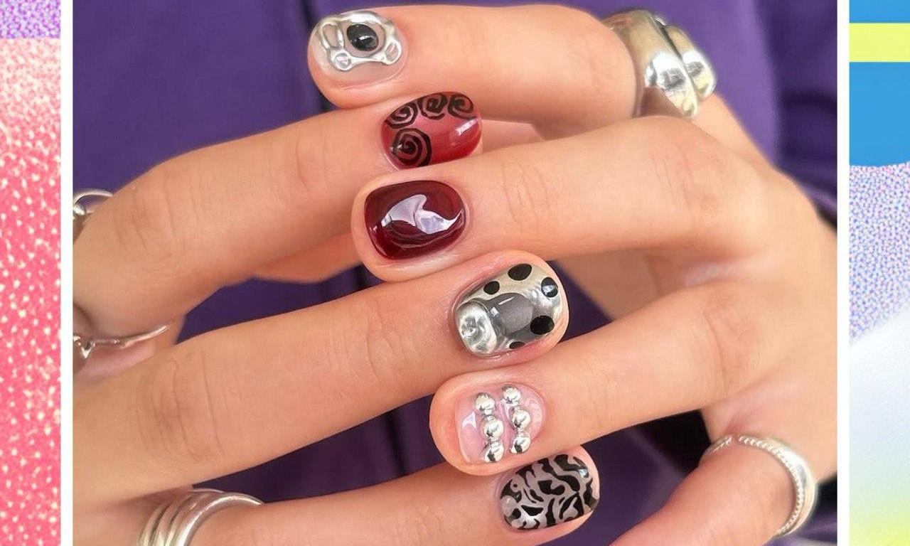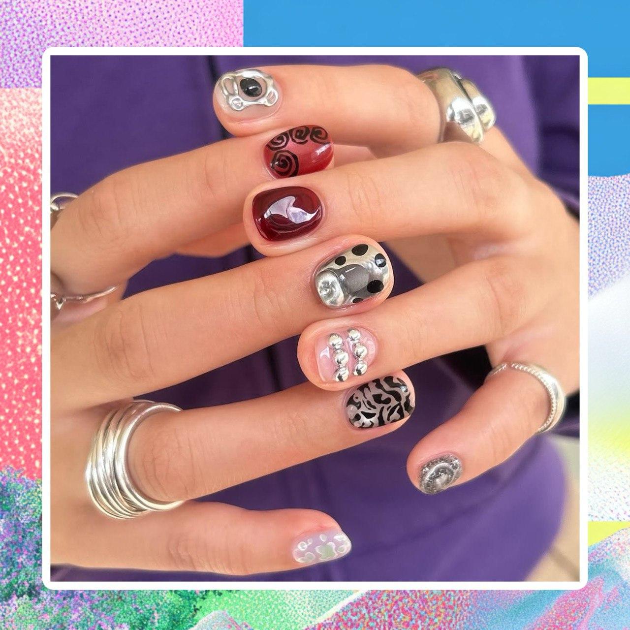 Еще один вариант маникюра с темными цветами — это сборная солянка из «кошачьего глаза», синего, бордового и серебристого. Добавляй в маникюр объемы, ведь сейчас они в тренде. Не забудь и про трайблы — эффектный рисунок из необычных линий.
