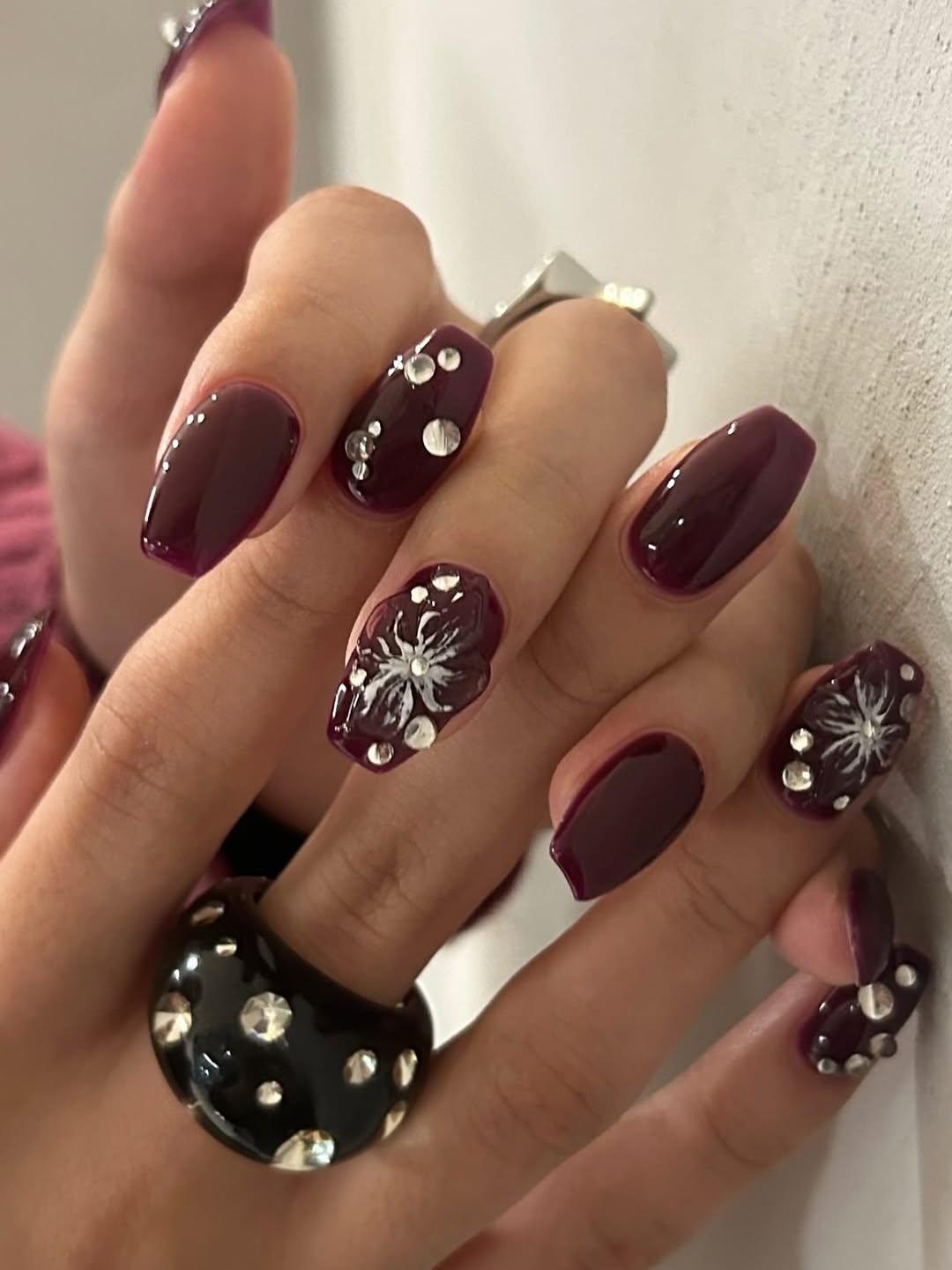 Или же нанеси на несколько ногтей бордовый лак, а на других сделай белый дизайн на серебряной базе. Тут отлично будут выглядеть цветочные мотивы — нежно, но небанально. С таким маникюром ты точно захочешь красиво наряжаться и добавлять в образ женственные готические мотивы 🖤