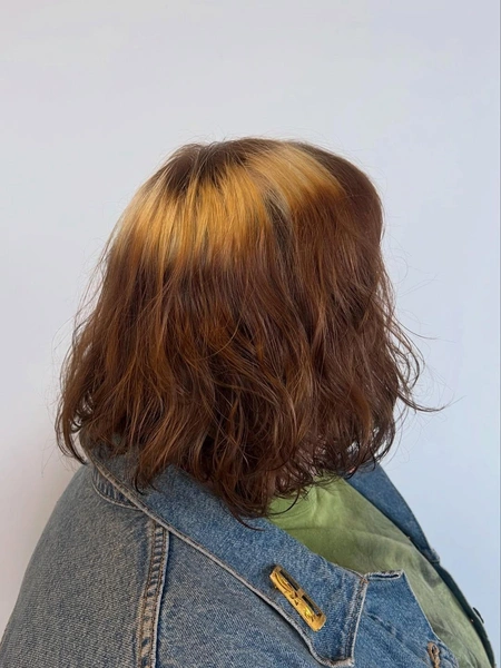 На такой длине выше плеч цветная полоса часто размещается не строго горизонтально, а с учетом формы стрижки. Первый вариант — «нимб», который размещается на уровне скул. Это идея для удлиненного боба, например. А второй вариант — контрастная полоска на самой макушке, зоне короны. Этот тип окрашивания идеально смотрятся на более коротких волосах, которые достигают лишь линии челюсти.