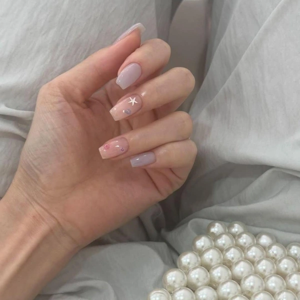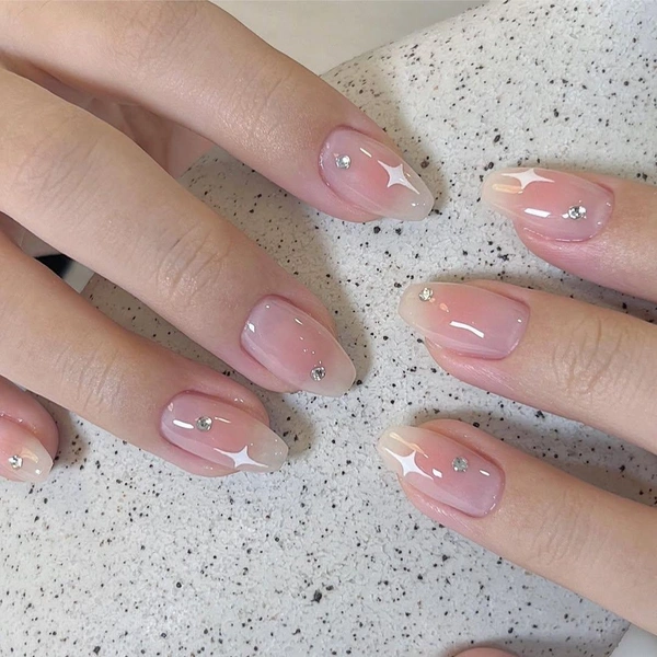 Эта формула маникюра уже стала классикой. Нанеси на ногти нюдовый лак, потом в серединке каждого размести персиково-розовую базу, а затем нарисуй белые звездочки. Если хочешь объема, то добавляй и стразы серебряного цвета.