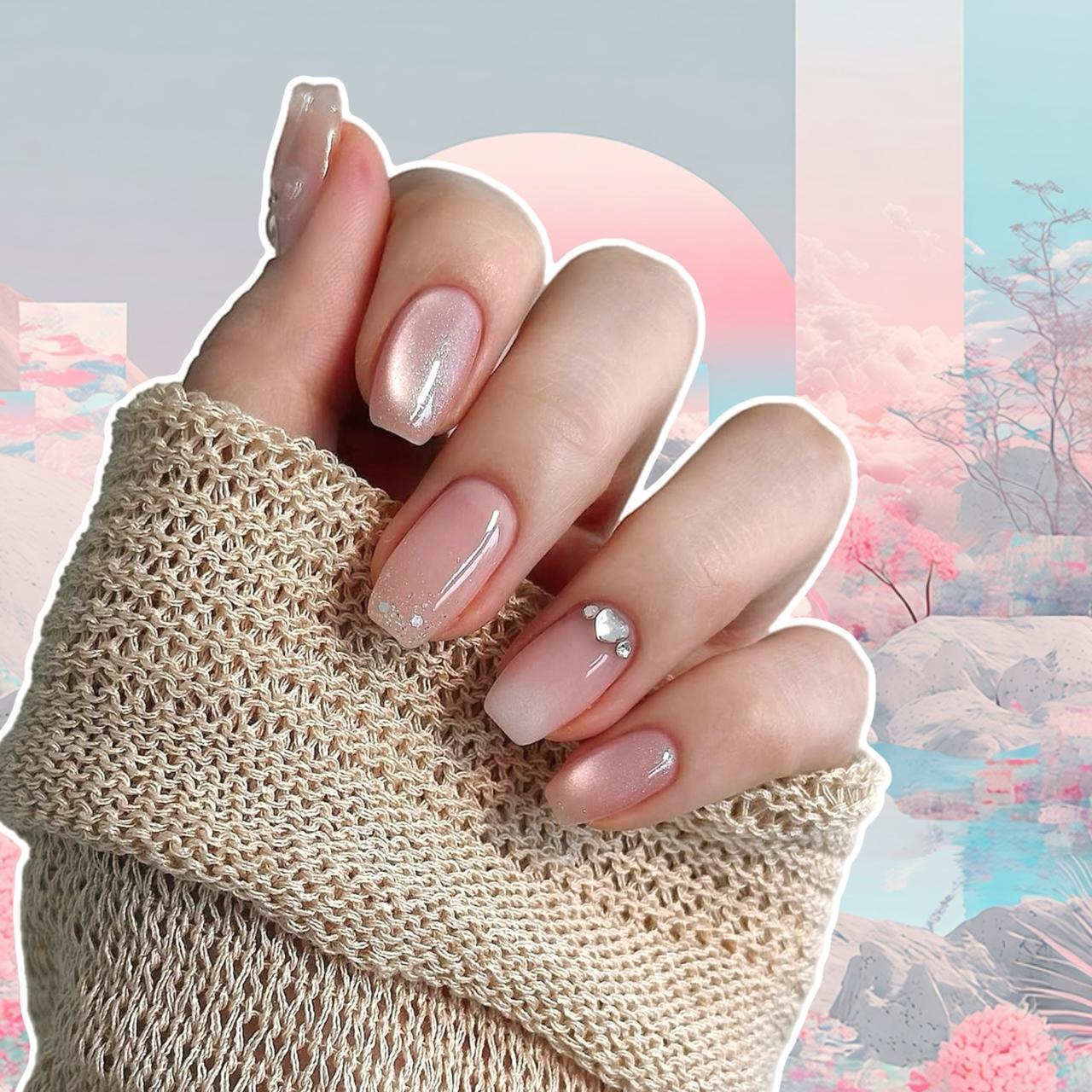 Если что, я не про розовые цветочки на каждом ногте (хотя и они имеют право на жизнь). Сейчас в моде изящные текстуры, минимализм, дизайны с разными деталями на каждом ногте и корейская эстетика. Любишь сияние? Выбирай блестящий нюд. Хочешь закат на кончиках пальцев? Персиковая аура с жемчужной втиркой — твой вариант. Даже тёмный маникюр весной выглядит довольно нежно и женственно.