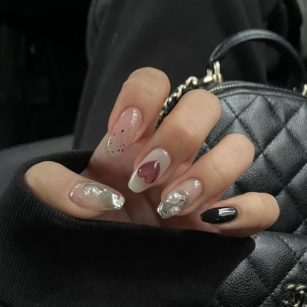 Темный маникюр тоже может быть женственным! Нарисуй на одном ногте сердечко, на другом сделай градиентный френч из темного глиттера, а еще один пальчик просто покрой черным лаком. Для остальных ноготков выбирай что-то серебристо-жемчужное.