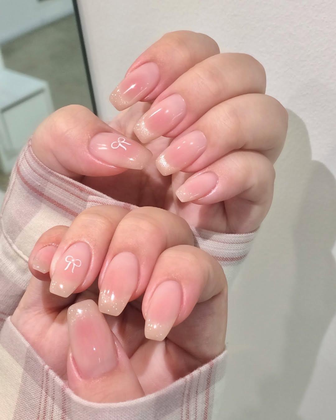 Кто, если не кореянки, знает толк в необычных маникюрах? Да и красивые нюдовые оттенки они тоже любят. Так что предлагаю вдохновиться этим маникюром и нарисовать на ногтях милые рисунки, изящные бантики, десерты, украсить пальцы стразами и блестками.