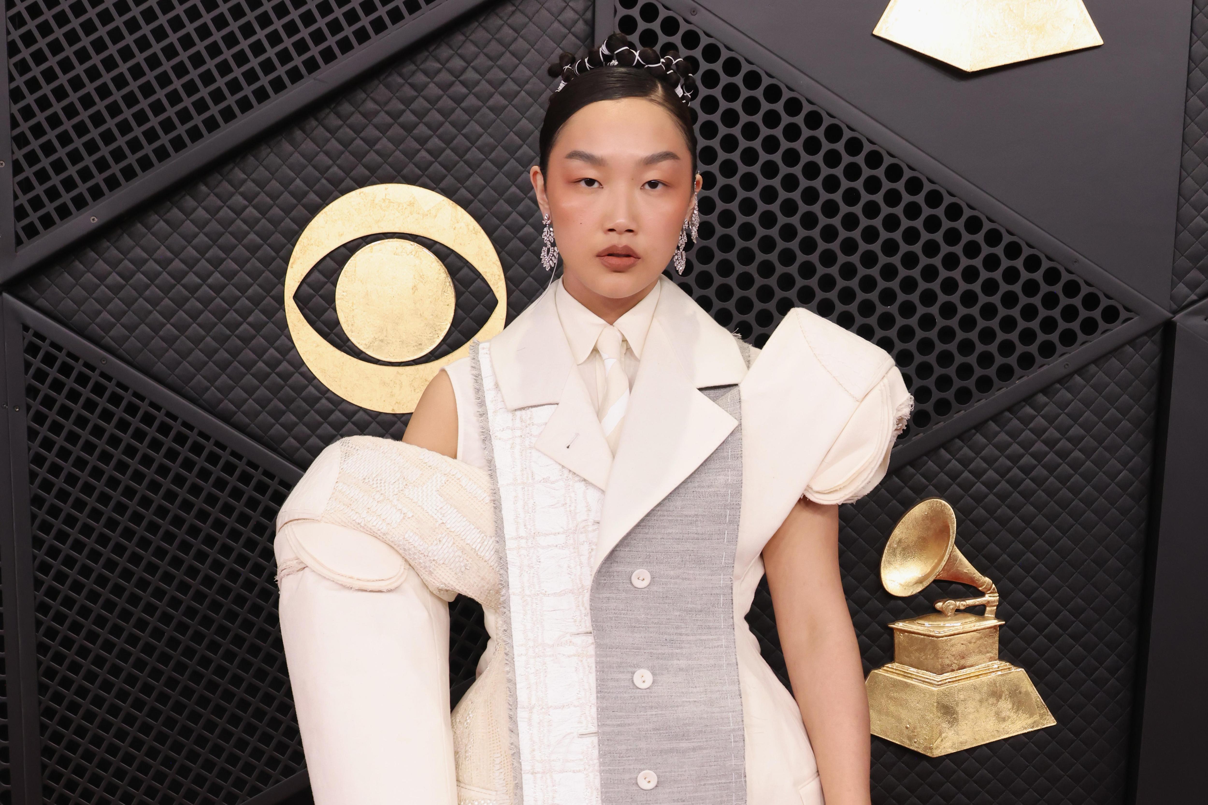 Одри Нуна из «Кейпоп-охотниц на демонов» вышла на красную дорожку «Грэмми» в необычном белом платье с элементами деконструкции. К такому сложному наряду она добавила монохромный макияж в коричневой гамме, который не выглядел слишком уж нюдовым. А ее прическа продолжила необычную эстетику, заданную нарядом, — пучок, перетянутый кучей тонких веревочек.