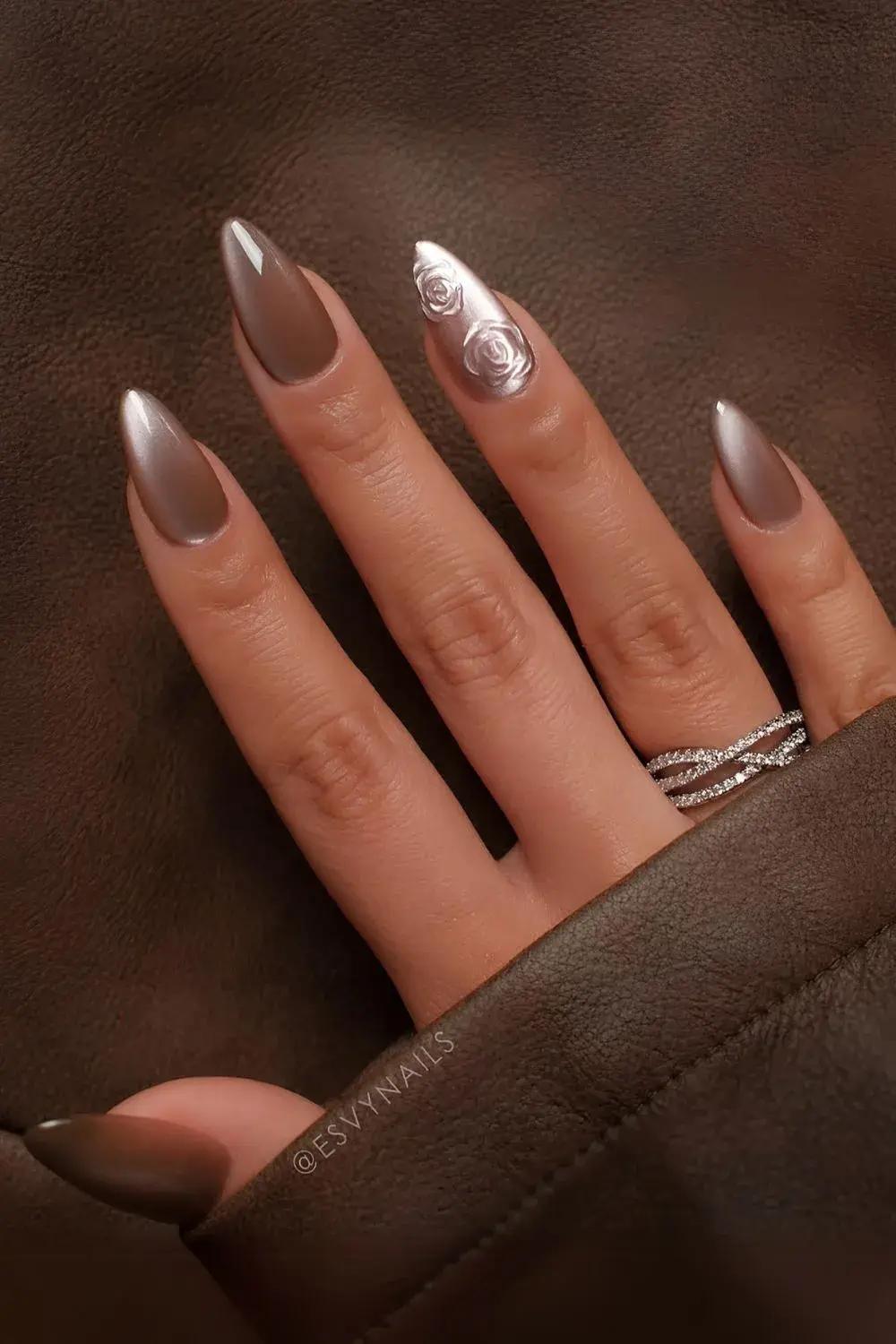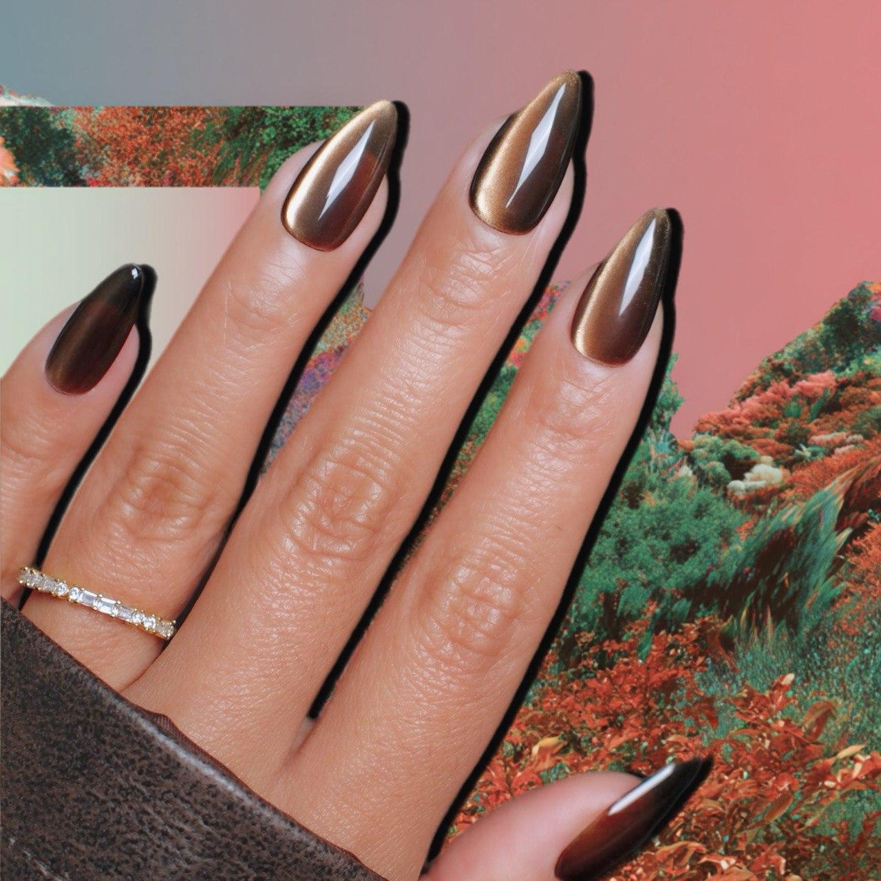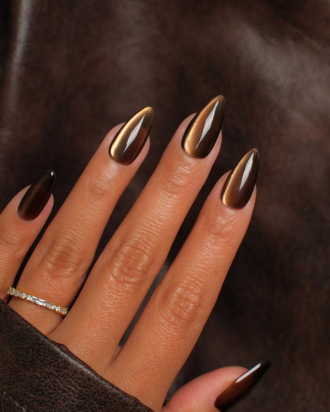 Если тебе нравятся шелковые «кошки», то в коричневом цвете они смотрятся особенно роскошно. Такой маникюр будет сочетаться с деловыми рубашками, нарядными блузками и изящными джемперами. А на красивые переливы отлично будут видны даже на ногтях короткой длины.