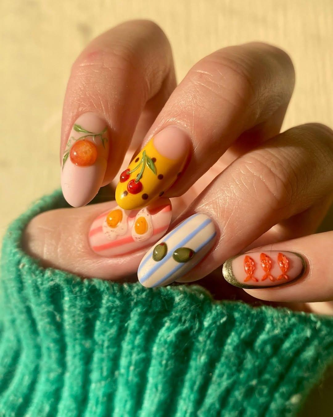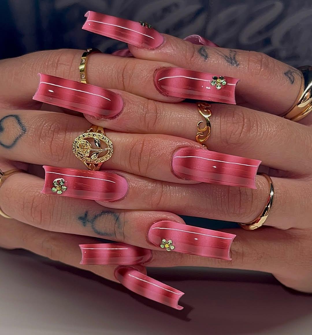 Поиграй с тонкими линиями, а поверх них нанеси блестящий лак — это добавит праздничного настроения. Если хочется чего-то более нежного, попробуй расплывчатые полоски в стиле градиента. А чтобы добавить еще больше креатива, укрась полосатые ногти милыми рисунками: оливками, вишенками или маленькими цветочками.