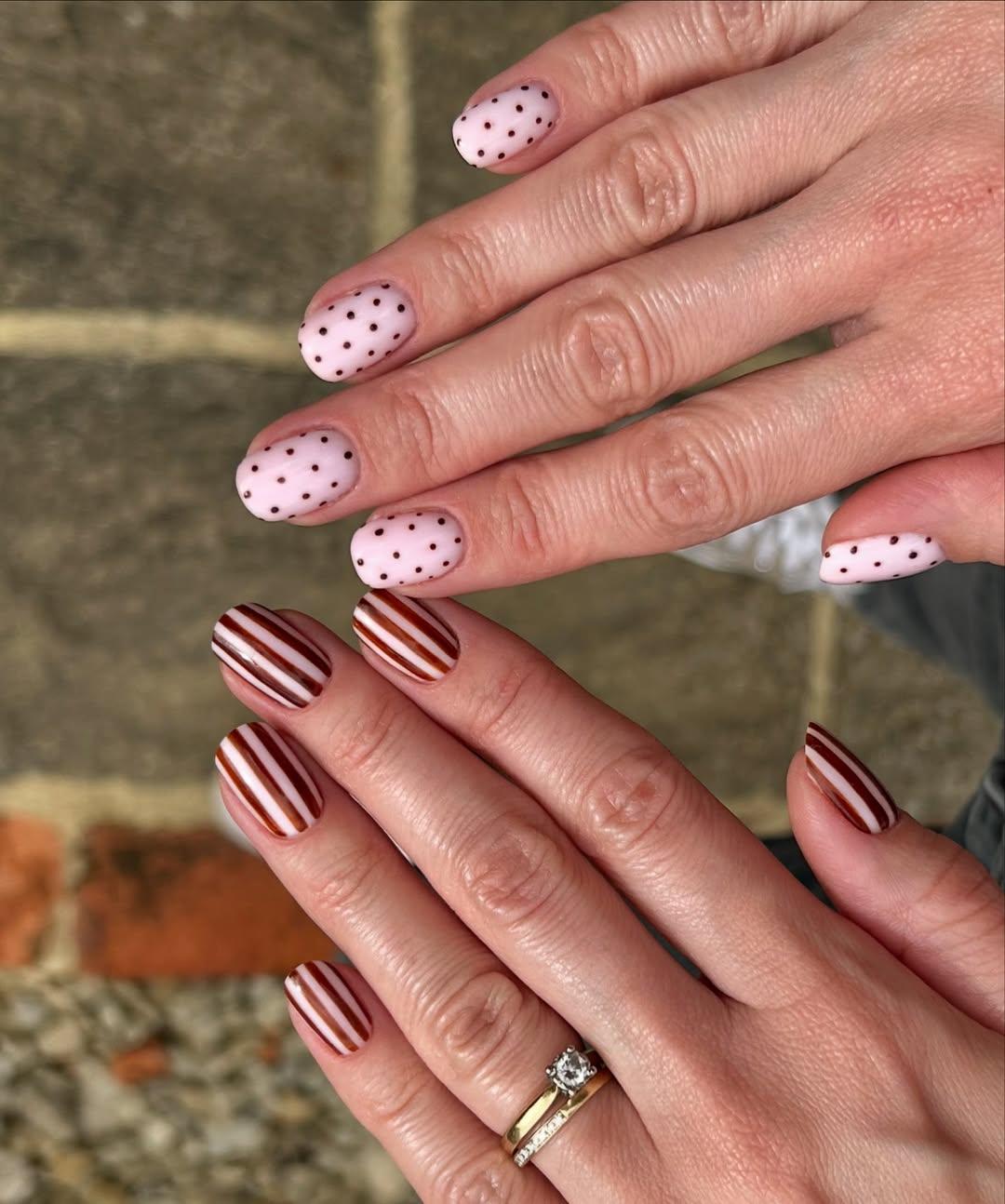 А для тех, кто любит смелые контрасты, отлично подойдет идея двойного маникюра: на одной руке сделай горошек, который был трендом летом, а на другой — полоски, подчеркивая новизну осеннего сезона. Можно также чередовать эти два дизайна на одном маникюре.