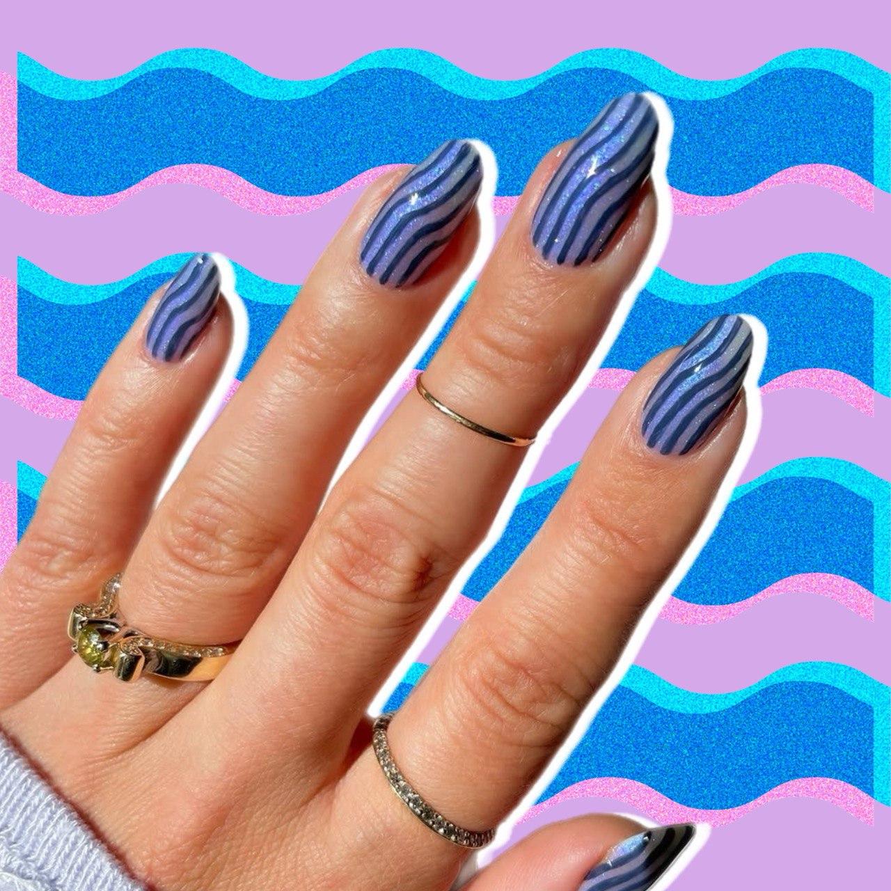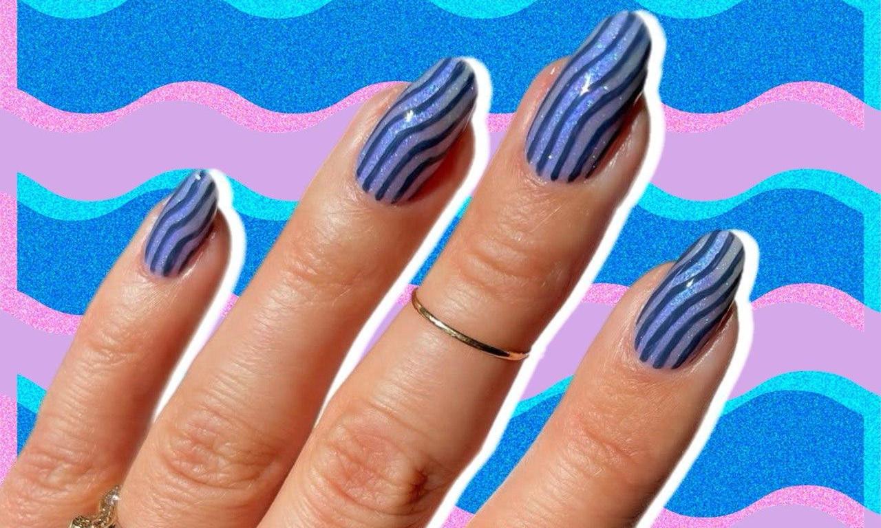 Кстати, не обязательно делать полоски ровными. Они могут быть и волнистыми тоже. Такую форму можно сочетать с необычным блестящим фоном. Нанеси на ногти шиммерный лак голубого цвета, а синим нарисуй волны. Готово! Такой маникюр можно сделать в любом цвете, который нравится.