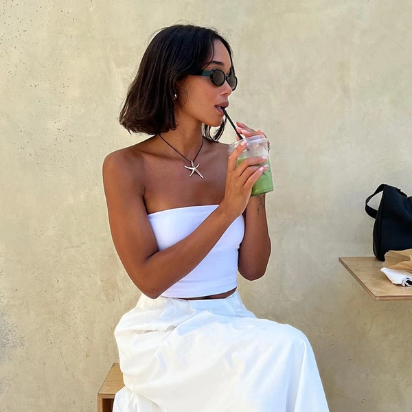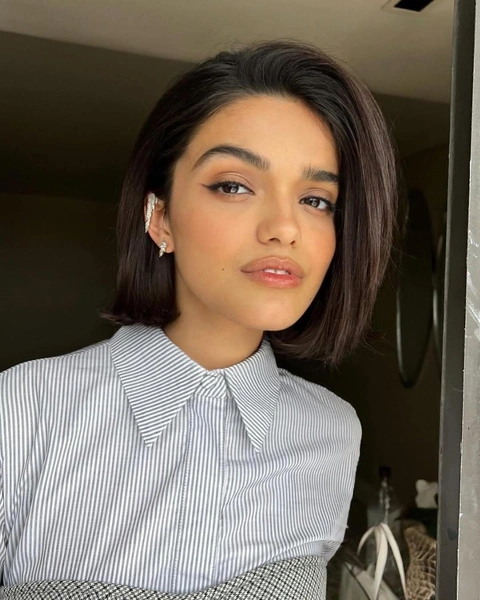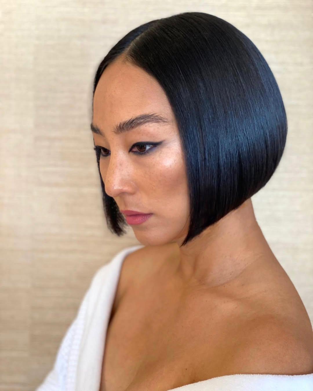 Эстетика голливудских красавиц привлекает всех, кто хочет выглядеть женственно. Короткий боб чуть ниже подбородка с боковым пробором и подкрученными кончиками создают образ в стиле «тихая роскошь». Такая прическа станет лучшим дополнением элегантного лука!