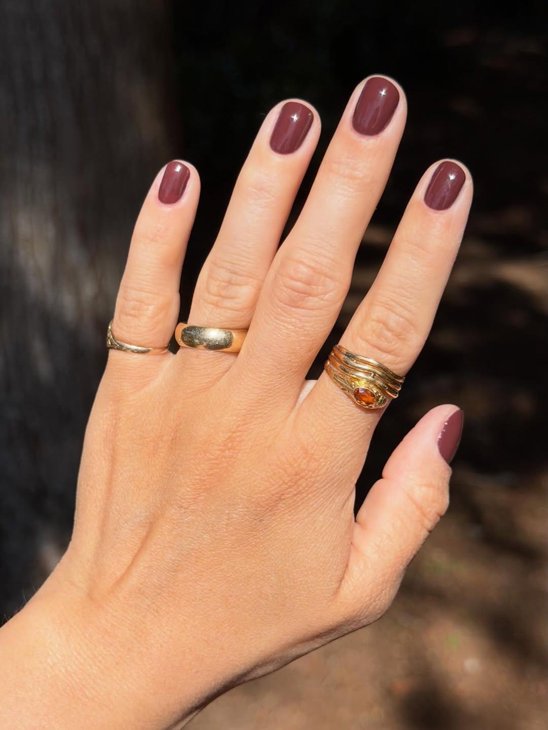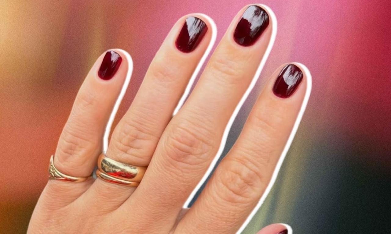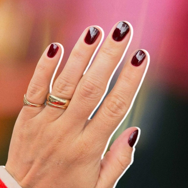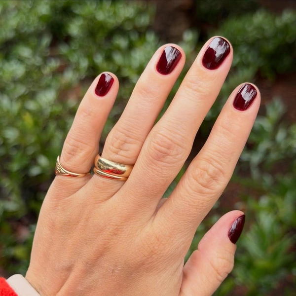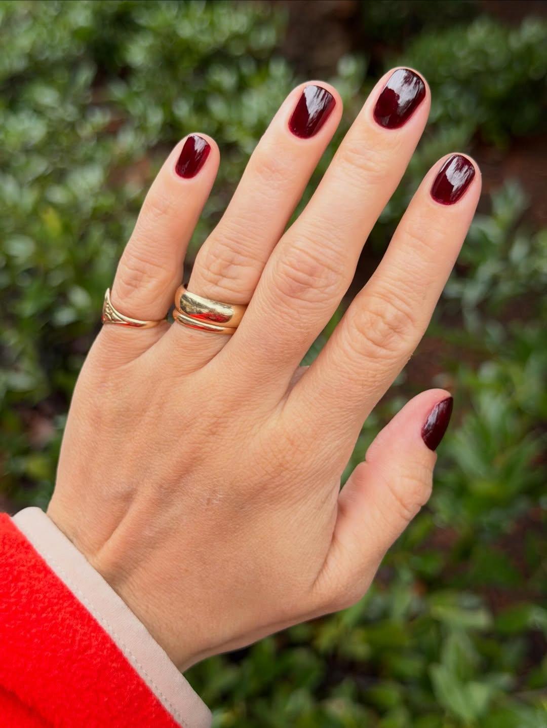 Бордовый лак тоже смотрится роскошно. Конечно, он больше подходит для осенних образов, но кто запретит носить его весной или даже летом? Это очень благородный тон, который круто выглядит на абсолютно всех девушках. Главное — нанести сверху самый глянцевый топ!