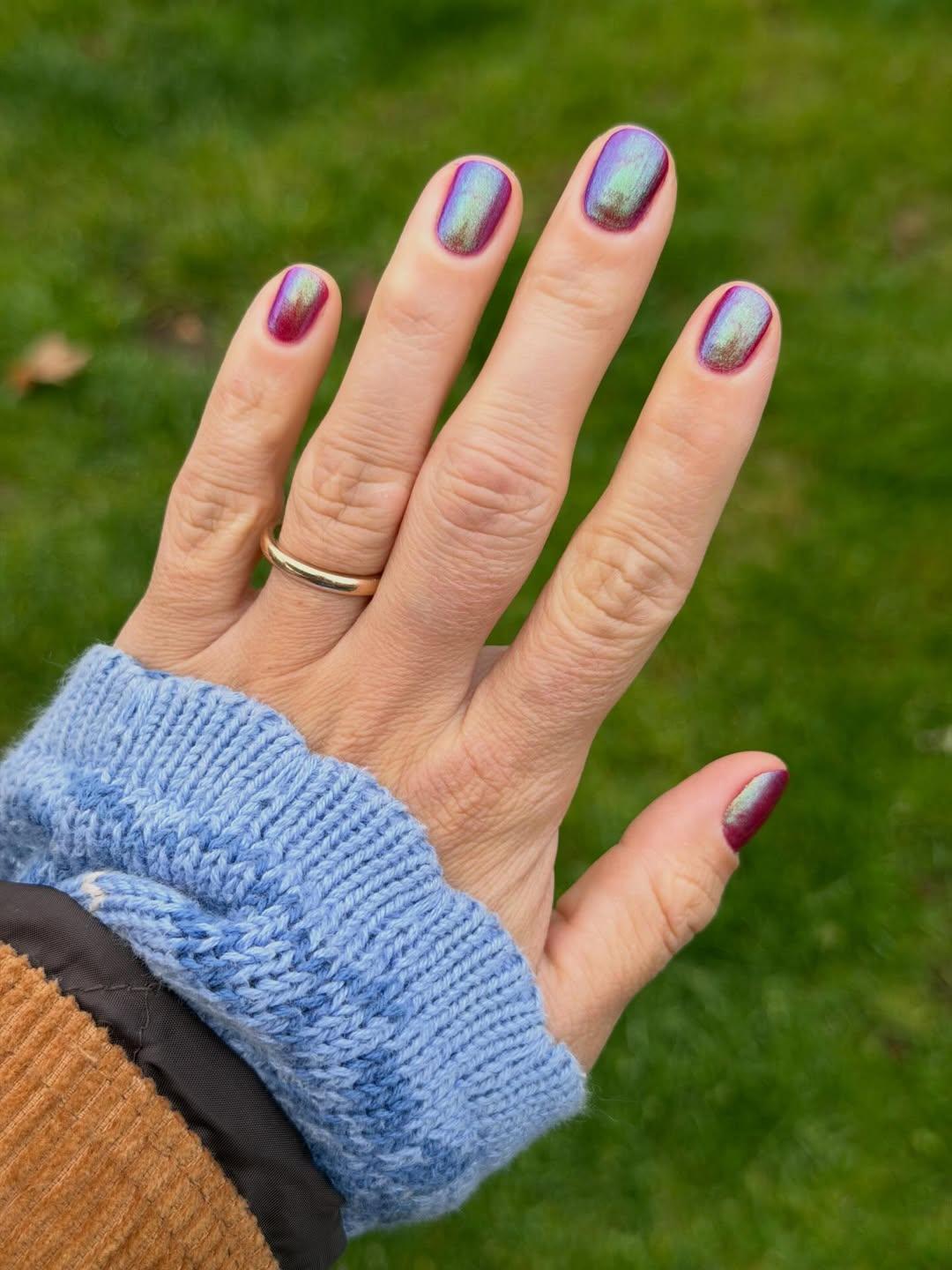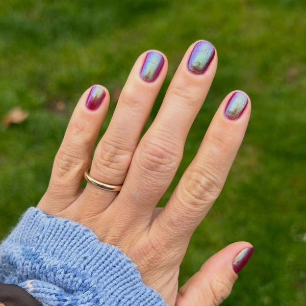 Если тебе нравится красноватая гамма, то попробуй виноградный оттенок. Но не простой, а с кучей зелено-голубых блесток. Такой маникюр будет смотреться просто нереально круто! Цвет придаст ему изысканность, а шиммер сделает ногти современнее.