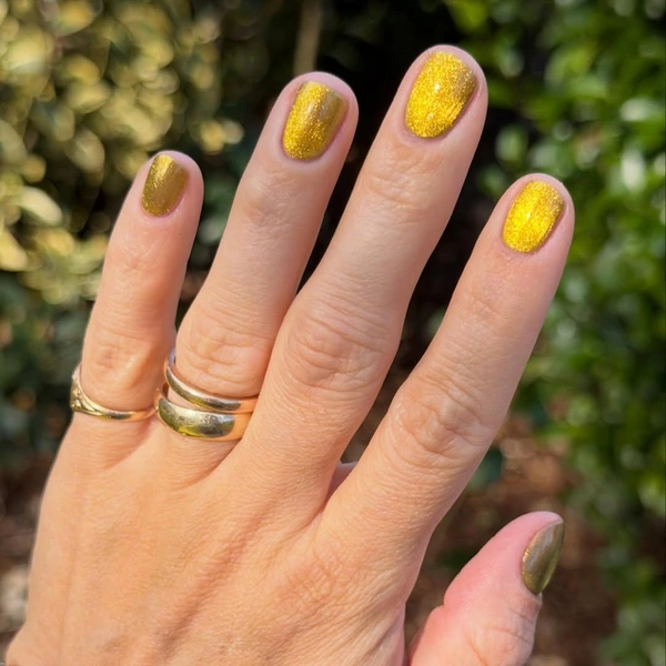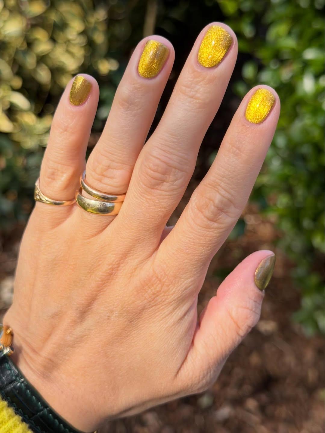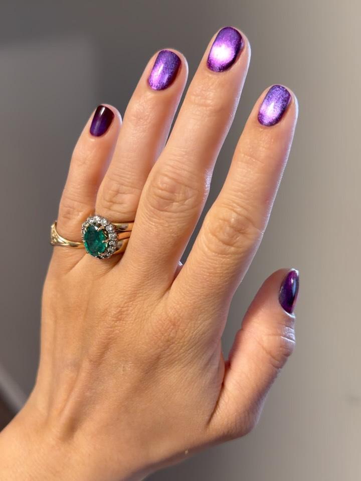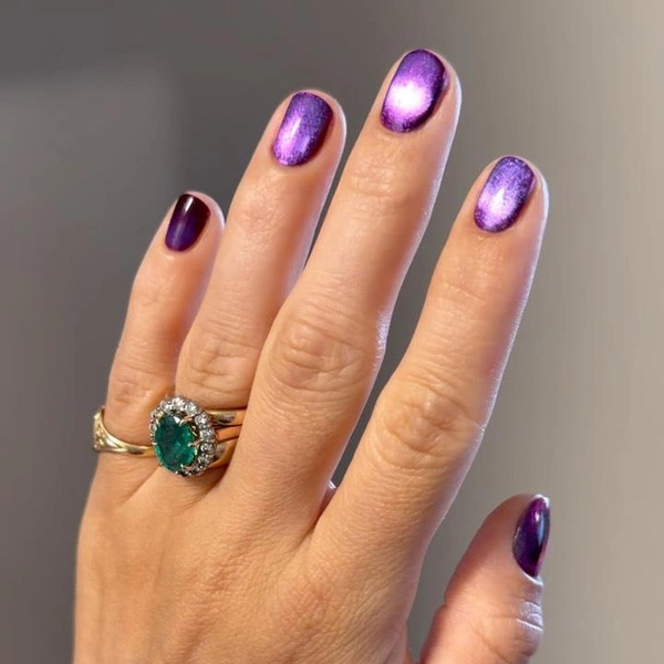 Золотой, серый и фиолетовый тоже станут классными вариантами дорогого маникюра. Они украшают руки не хуже ювелирных украшений. Особенно хороши варианты лаков с эффектом «кошачий глаз», которые выглядят по-разному под каждым углом.