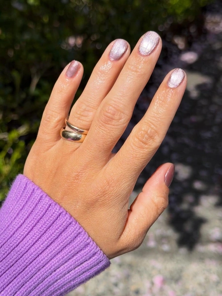 Начну, пожалуй, с красивого лавандового «кошачьего глаза». Он выглядит как дизайн, но вообще-то это тоже однотонный лак. Ну а если хочется чего-то поинтереснее, то сделать это легко. Магнитом ты можешь создать любой узор: от классического блика в центре до горизонтальной или вертикальной полоски.