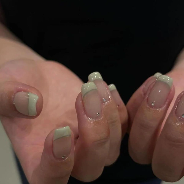 Чтобы повторить этот маникюр, выбирай два лака в разных оттенках одного цвета — пастельный и чуть более темный. Например, салатовый и зеленый. Светлым цветом нарисуй френч, а насыщенным подведи линию улыбки. Если любишь стразы, то их тоже можно добавить у зоны кутикулы.