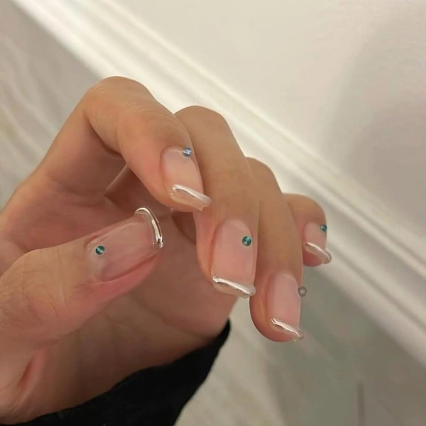 Начинаю с самого минималистичного, но очень необычного дизайна ногтей. В нем френч выполнен в виде объемной серебристой линии на кончиках коротких ногтей. А в виде яркого акцента использованы разноцветные стразы около кутикулы.