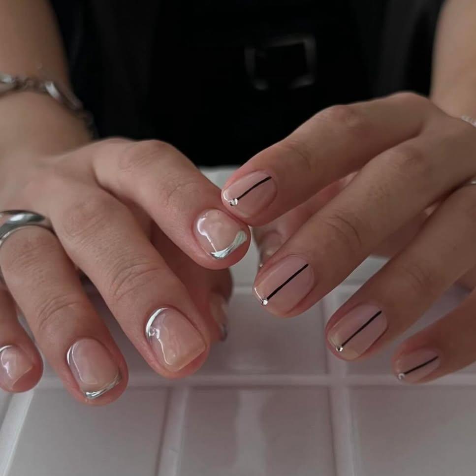 Френч на кончиках иногда кажется скучным, так что предлагаю рисовать его и у кутикулы. Тут все просто, нужно лишь сделать линию, повторяющую полукруг у основания ногтя. Это отражение обычного френча. В серебристом цвете этот дизайн смотрится особенно стильно!
