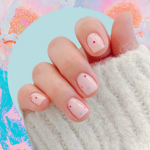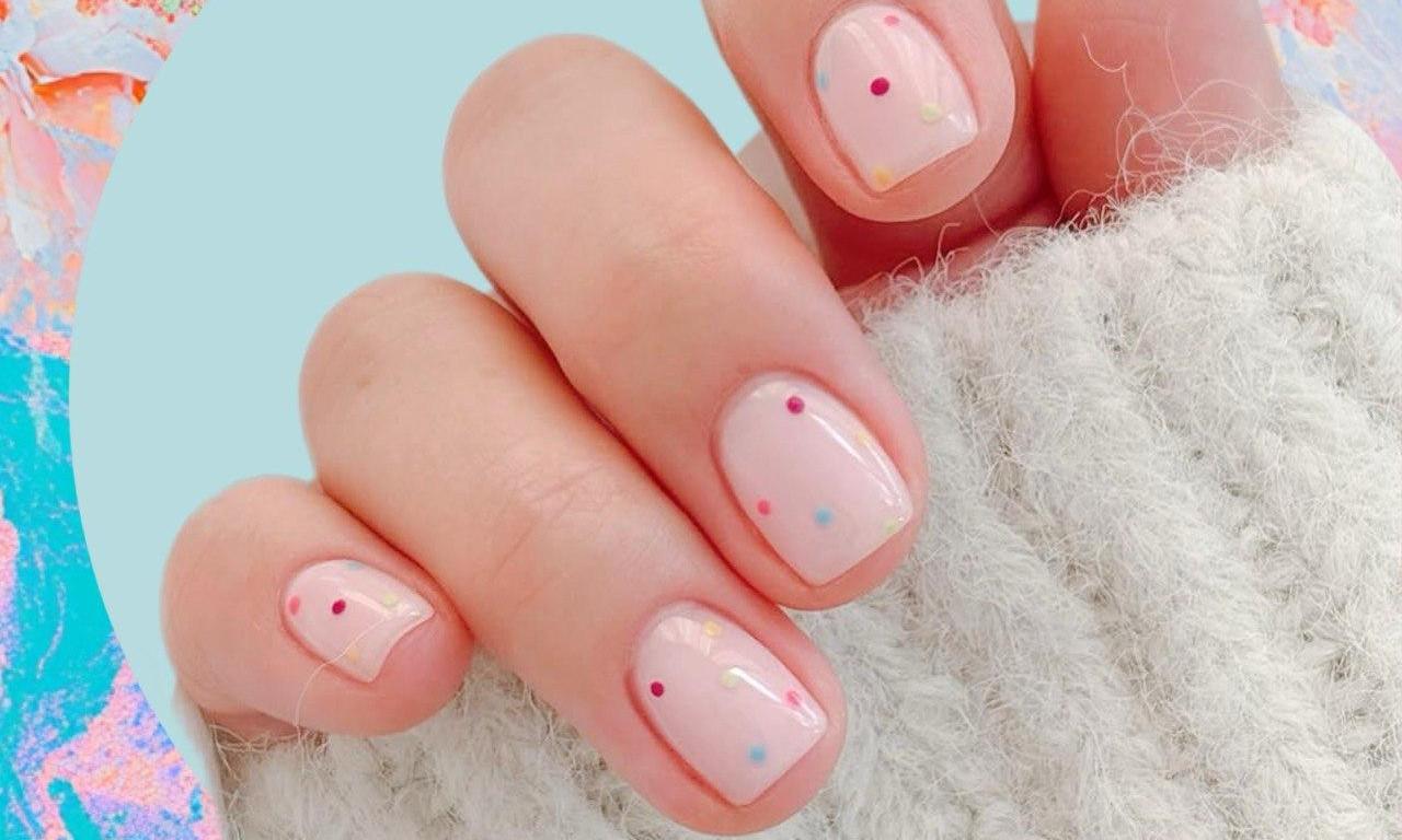 Нет ничего проще нюдового маникюра в горошек! Аккуратно и красиво нанести молочную основу получится у каждой, а потом нужно лишь поставить на ногтях точки разного цвета. Выбирай яркие лаки, которые красиво друг с другом смотрятся.