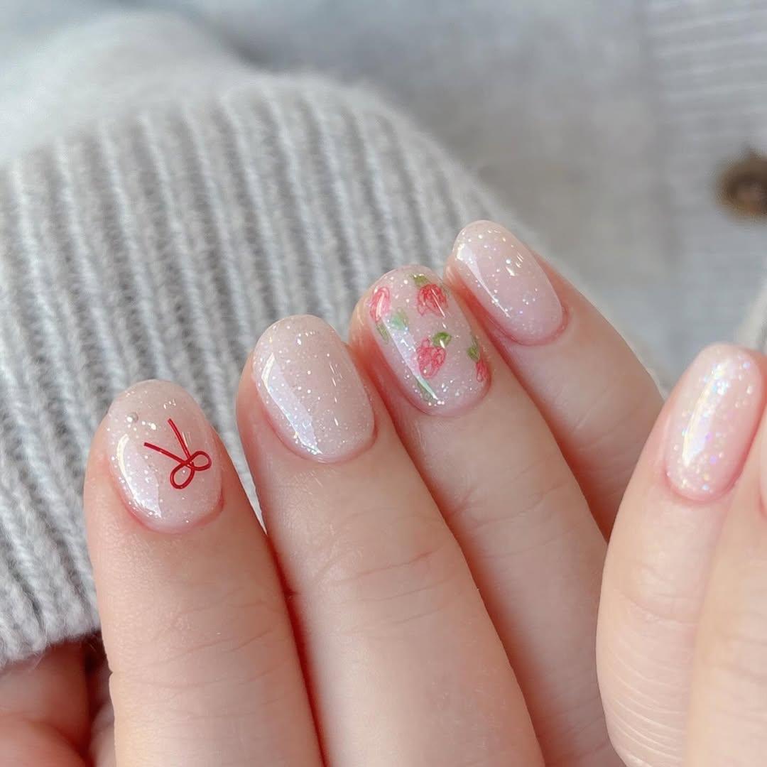 Если ты не любишь париться с дизайнами, но и однотон носить не хочешь, то повторяй этот вариант. Нанеси на ногти молочный лак с блестками, а поверх одного ногтя нарисуй розочки. На другой можешь приклеить бантик из красной проволоки. Готово!