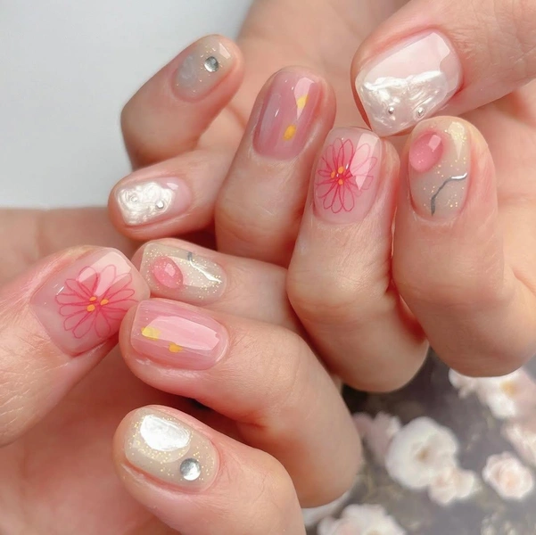 Главный цвет в этом маникюре — розовый. Нанеси его на несколько ногтей и укрась цветочными рисунками, яркими пятнышками, объемными узорами. На остальных ноготках пусть будет бежевый блестящий лак со стразами или жемчужный дизайн.