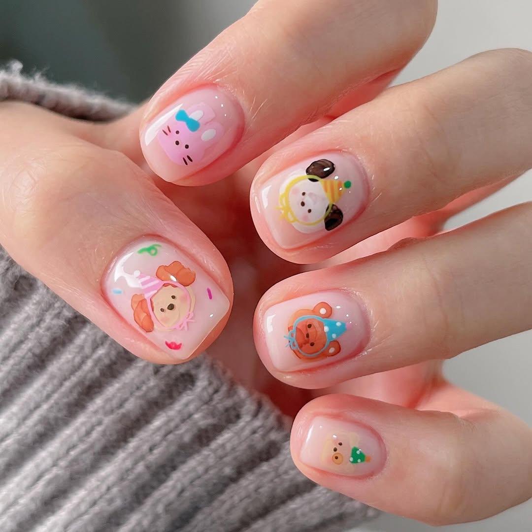 Если ты умеешь рисовать, то очень советую повторить этот маникюр. На каждом ногте размести милое животное в праздничных колпачках или с бантиками. Это могут быть мишки, кошки, собачки, зайчики. Или же неси идею маникюра к мастеру, если не хочешь рисовать сама!